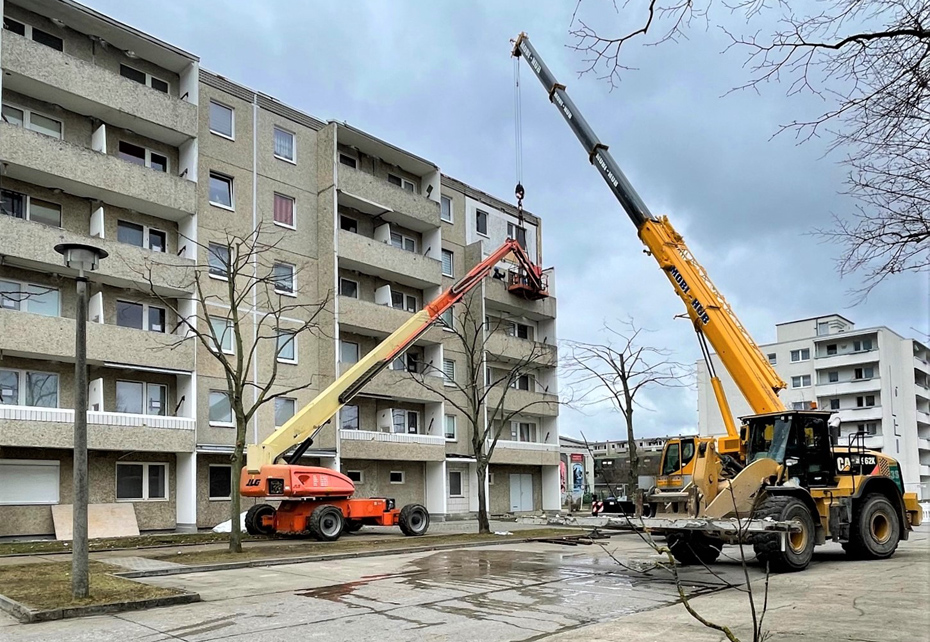 Die Demontage der alten Balkone in der Leverkusener Straße 33–41 und in der Kastanienallee 1–7 Mitte März 2021 ist der Startschuss für ein großes Stadtumbauprojekt der Wohnungsbaugenossenschaft (WOBAG).