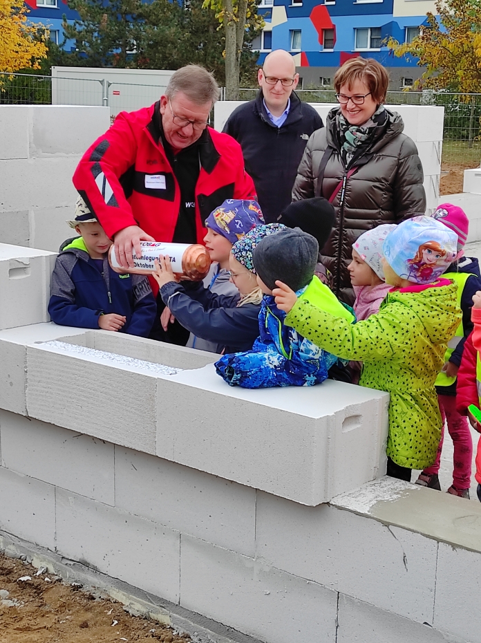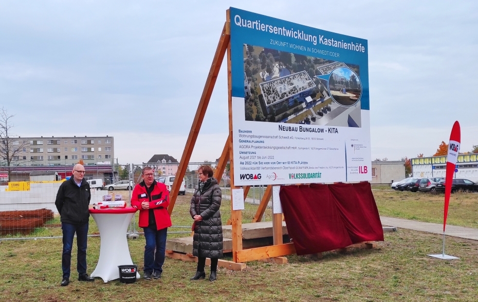 Am 19. Oktober 2021 erfolgte die Grundsteinlegung. Die neue Kita wird ab Sommer 2022 von der Volkssolidarität „Verbandsbereich Oberhavel-Uckermark“ übernommen und soll Platz für 60 Kinder beherbergen. Für die neue Einrichtung wurden verschiedene Namensideen gesammelt. Aus 23 Vorschlägen wählte die Volkssolidarität zwei aus, über die online abgestimmt wurde. Der zukünftige Name lautet „Kastanienbande“.