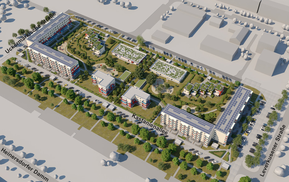 Es umfasst die Bestandsobjekte: Leverkusener Straße 33–41, Kastanienallee 1–7, 9–15, 17–23, 25–33 und die Uckermärkische Straße 26–34. Weiterhin ist eine Quartiersgestaltung durch den Neubau einer Kita, einem Wohngemeinschaftsbungalow für palliativmedizinische Pflege und einer Stadtvilla vorgesehen. Parallel dazu erfolgt der Abriss der Bestandsobjekte Kastanienallee 9–15 und der Kastanienallee 17–23. Auch der Verbinder zwischen der Kastanienallee 23 und 25 wird abgerissen.