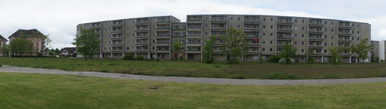 Es handelt sich um einen freistehenden, 6-geschossigen, nicht unterkellerten Wohnkomplex, zwei aneinander gereihte Wohnblöcke, in Plattenbauweise (P 2). Zwischen den Aufgängen 18 und 20 ist ein dem Aufgang 20 zugehöriger Verbinderbau angeordnet. In den 10 Aufgängen befanden sich 104 Wohnungen.