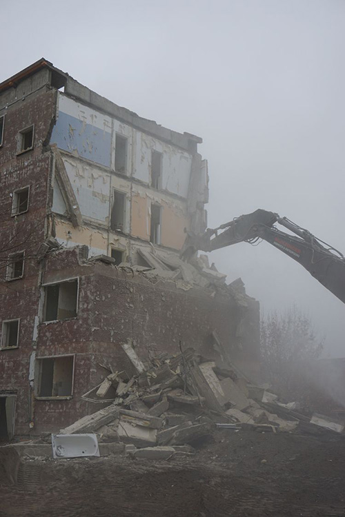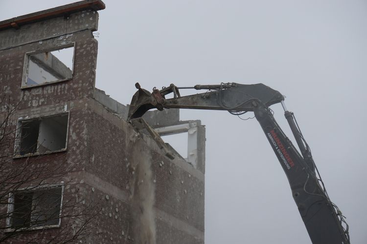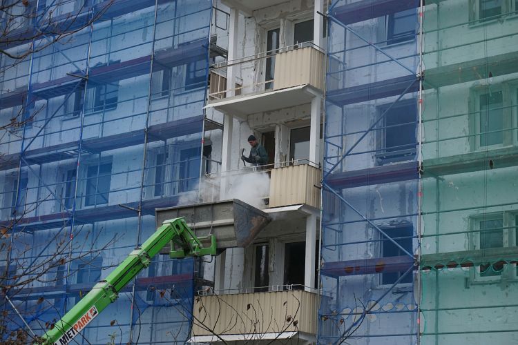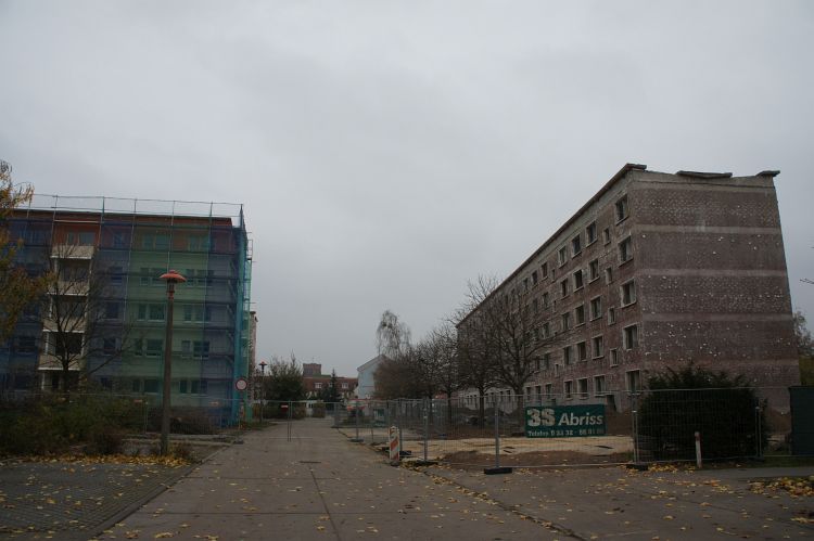 Im Oktober 2014 begannen die Entkernungsarbeiten an den Wohnhäusern Heinersdorfer Straße 1–15, Clara-Zetkin-Straße 8–14 und 15–22, bevor am 18. November 2014 der Hydraulikbagger begann, den ersten Wohnblock in der Clara-Zetkin-Straße abzureißen.
