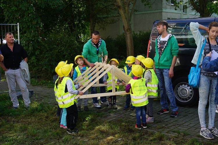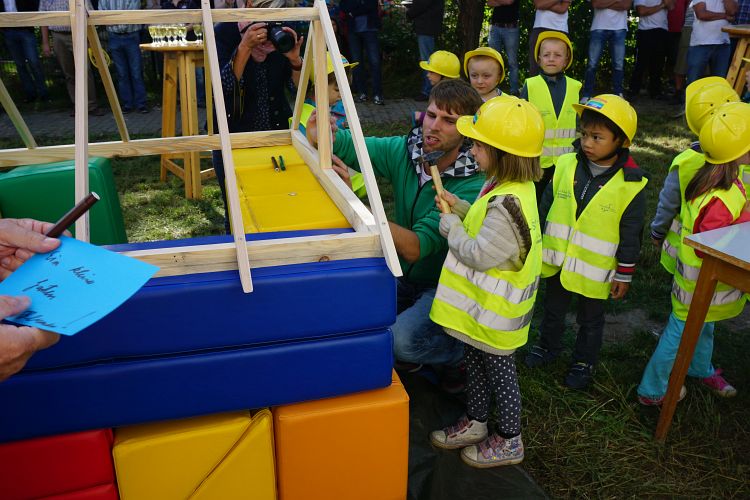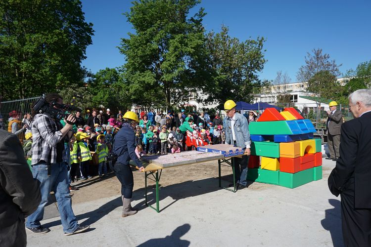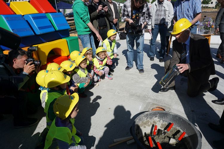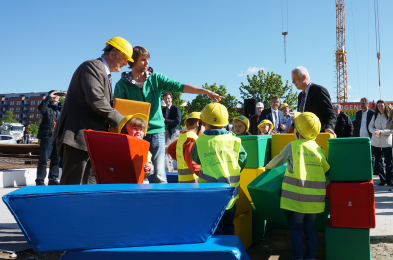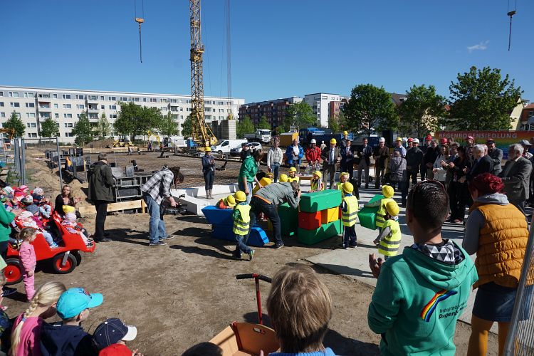 Es folgte die offizielle Grundsteinlegung am 7. Mai 2015 mit den Kindern der benachbarten Kita „Regenbogen“ als Ehrengäste, die mit Bauhelmen und Warnwesten zu Bauarbeitern wurden. Sie bauten vor den eigentlichen Häusern ihr eigenes Haus aus großen Schaumstoffteilen.