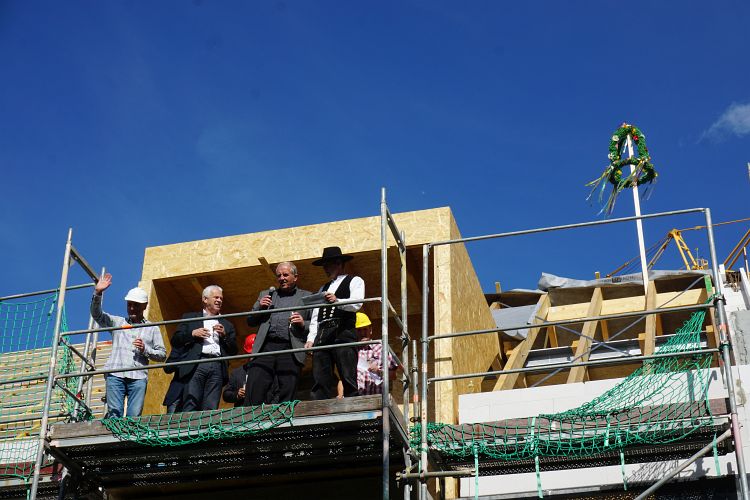 Stellvertretend für das gesamte Bauvorhaben „Mehrgenerationenwohnen“ wurde am 15. September 2015 schließlich auf eines der Häuser die Richtkrone gesetzt und traditionsgemäß Richtfest gefeiert. Zu diesem Anlass setzten auch hier die Kinder der Kita Regenbogen ihren selbstgezimmerten Dachstuhl auf ihr Haus aus Schaumstoffteilen.