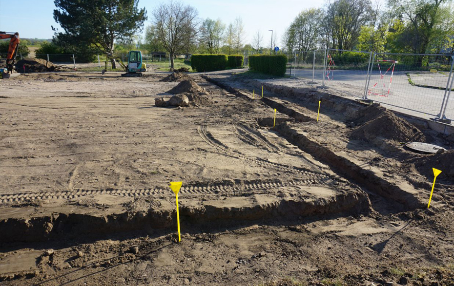 Als Voraussetzung für die Errichtung des Service- und Sozialgebäudes waren verschiedene Vorarbeiten notwendig. Im ersten Bauabschnitt erfolgte dazu die Baufeldfreimachung mit der Beseitigung der alten Flächenbefestigungen, Ausstattungsgegenstände und Gebäude. Dazu gehörten erste Kanalisationsarbeiten, um auf dem Grundstück genutzte Gebäude weiterhin mit Strom und Trinkwasser zu versorgen.
