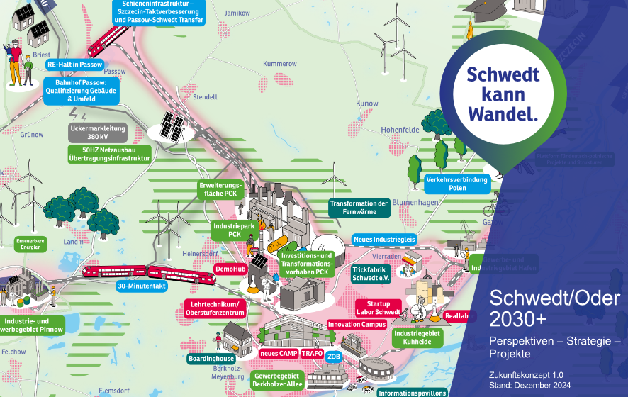 Eine zentrale Grundlage, um unseren Wirtschafts- und Industriestandort Schwedt im Rahmen der angelaufenen Transformation zu sichern und weiterzuentwickeln, stellt das Zukunftskonzept Schwedt/Oder 2030+ dar.