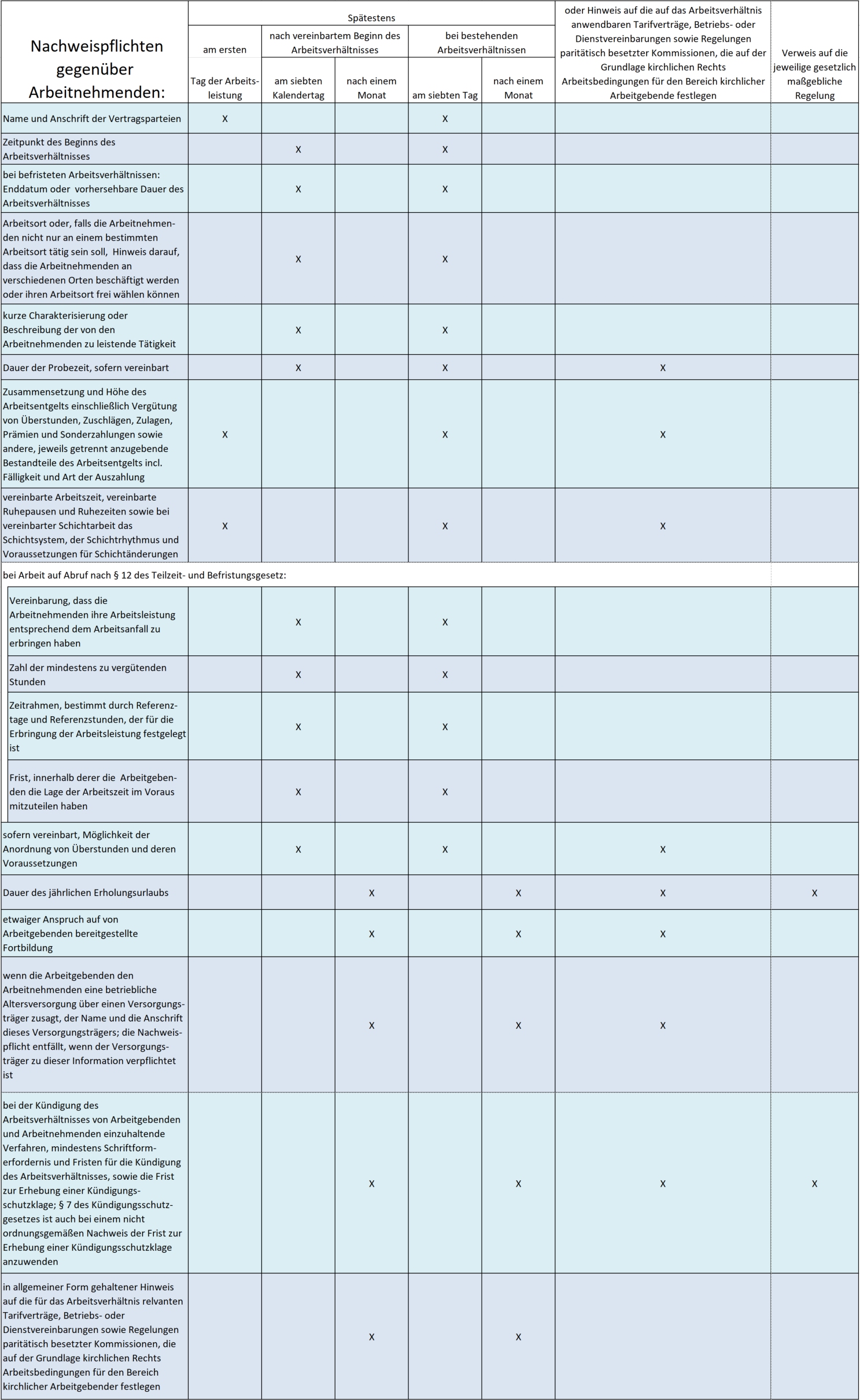 Die bis zum 31.07.2022 vorgesehene Pflicht der Arbeitgebenden zur Unterrichtung über die wesentlichen Aspekte des Arbeitsverhältnisses (sogenannte Nachweispflichten) wurde erweitert. Dies betrifft unter anderem Angaben zu folgenden Inhalten: