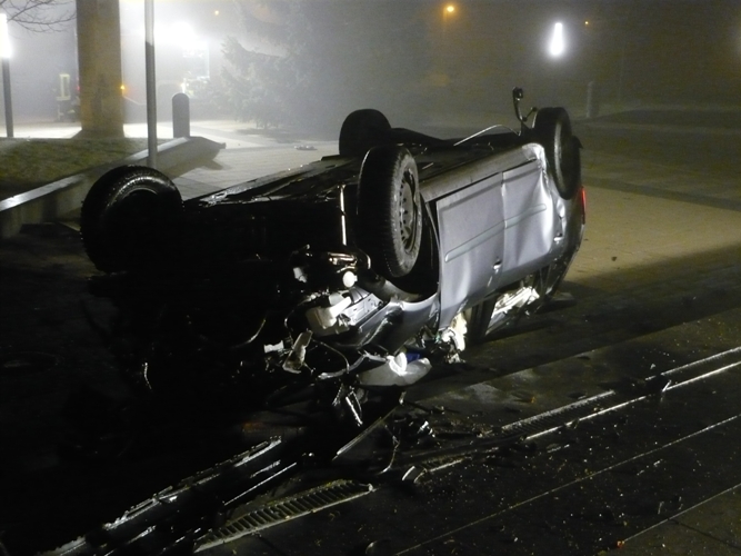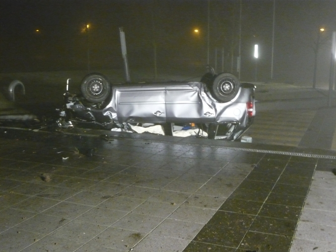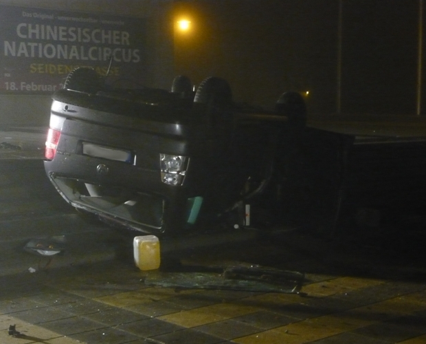 Bei Ankunft an der Einsatzstelle befand sich ein PKW, der auf dem Dach lag, auf dem oberen Treppenpodest der Uckermärkischen Bühnen. Es befanden sich keine Personen mehr im Kfz. Auch in der Umgebung wurde keine Person gefunden. Die Einsatzstelle wurde großräumig ausgeleuchtet.