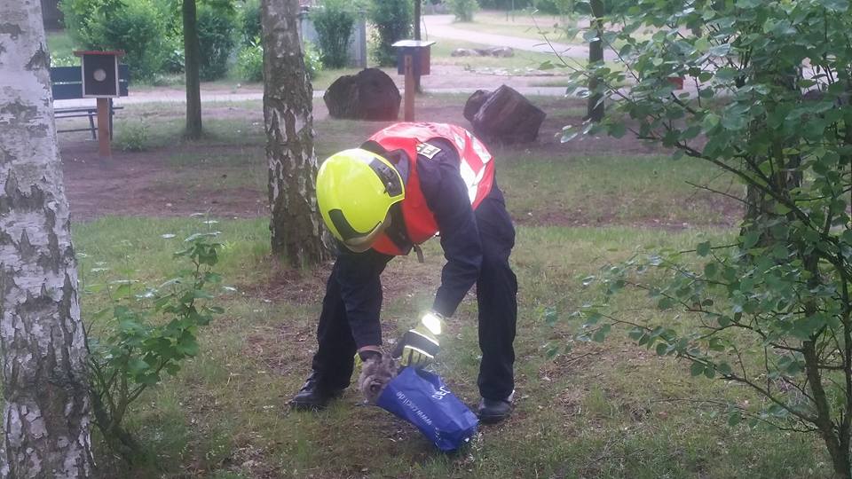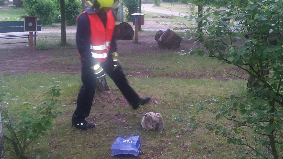 Die kleine Eule wurde in eine Papiertüte gesetzt und anschließend in ihr Nest gesetzt.
