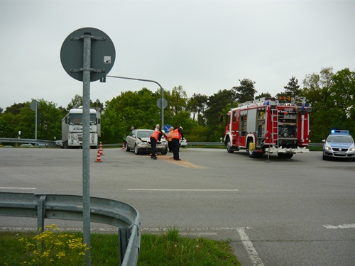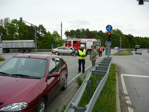Am 10.05.2012 wurden die hauptamtlichen Kräfte unter dem Stichwort „VU: 1" auf die B 166 - Kreuzung PCK alarmiert. Beim Eintreffen an der Unfallstelle wurde die verletzte Person bereits durch den Rettugsdienst versorgt. Die Feuerwehr sicherte die Einsatzstelle und nahm die auslaufenden Betriebstoffe auf.