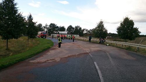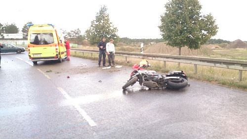 Gegen 16:43 wurde durch die Leitstelle Nord-Ost die Schwedter Feuerwehr unter dem Stichwort VU: 2 / verletzte Person nach Motorradsturz alarmiert. Nach Alarm- und Ausrückeordnung wurde neben den hauptamtlichen Kräften auch die Ortsfeuerwehr Schwedt 2. Zug und die Ortsfeuerwehr Gatow alarmiert. Bei Ankunft an der Einsatzstelle lag ein Motorrad in der "Hafenkurve" dicht an der Leitplanke. Der Fahrer des Krads war wie durch ein Wunder unverletzt, die Beifahrerin lag an der Leitplanke und wurde durch Ersthelfer betreut. Sie wurde durch den Rettungsdienst mit Verdacht auf Wirbelsäulenverletzung und Verletzungen der Bauchorgane ins Asklepios Klinikum Uckermark gebracht. Durch die Feuerwehr wurde die Einsatzstelle gesichert und der Rettungsdienst unterstützt. Im Anschluß wurde die Fahrbahn gereinigt und die ausgelaufenen Betriebsstoffe aufgenommen. Gegen 18:00 Uhr konnte die Einsatzstelle an die Polizei übergeben werden.