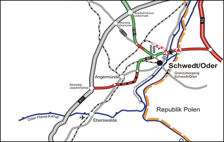 Autobahnen: A 11 und A 20 | Bundesstraßen: B 2 und B 166 | Landesstraße: L 284 | Grenzübergang nach Polen über die B 166