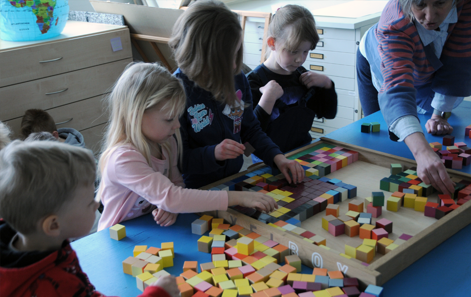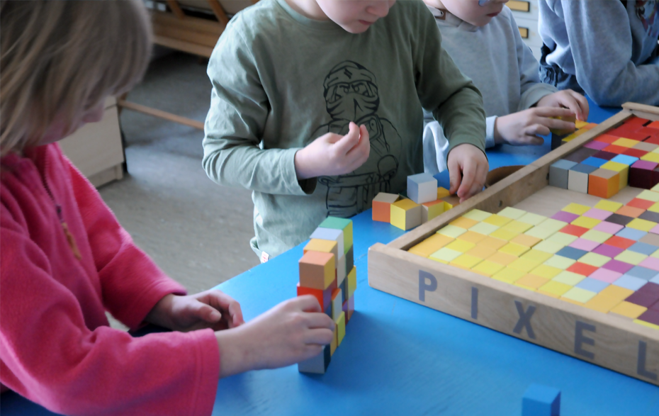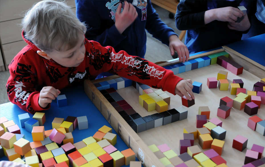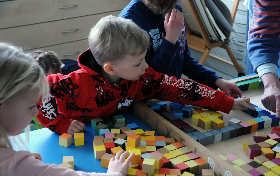 Nach all der Theorie folgte die Praxis. Die Kinder brannten darauf, selbst Skizzen zu den betrachteten Lieblingsbildern zu erstellen oder beim Mosaikpuzzle aus Holzwürfeln, die in unterschiedlichen Farbfamilien angestrichen sind, abstrakte Bilder zusammenzustellen. Begleitet und organisiert wurde diese Aktion von der Kunstpädagogin Annett Wagner, die seit August 2022 in der Kita die „kunstorientierte Früherziehung“ übernommen hat. Zusammen mit ihrem Kollegen an der Musik- und Kunstschule, dem Musikpädagogen Dennis Heinrich, und einem engagierten Kitateam ist das Wieder-erwecken von Interesse an Kunst und Musik in jeglicher Hinsicht Ziel und Vision für die nächsten Jahre.