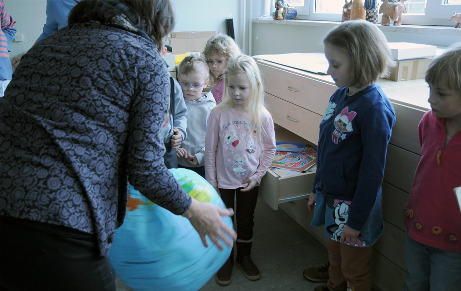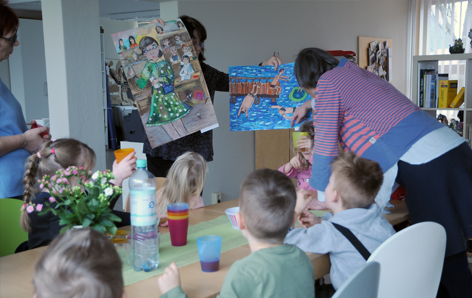 Christiane Wenzel, Mitarbeiterin im FLOW Team, führte die Kinder durch die Arbeitsräume, zeigte ihnen die geordneten Arbeiten aus mehr als 50 Jahren, erzählte dazu tolle Geschichten und erklärte, wie eine Jury die schwierige Aufgabe der Auswahl trifft.