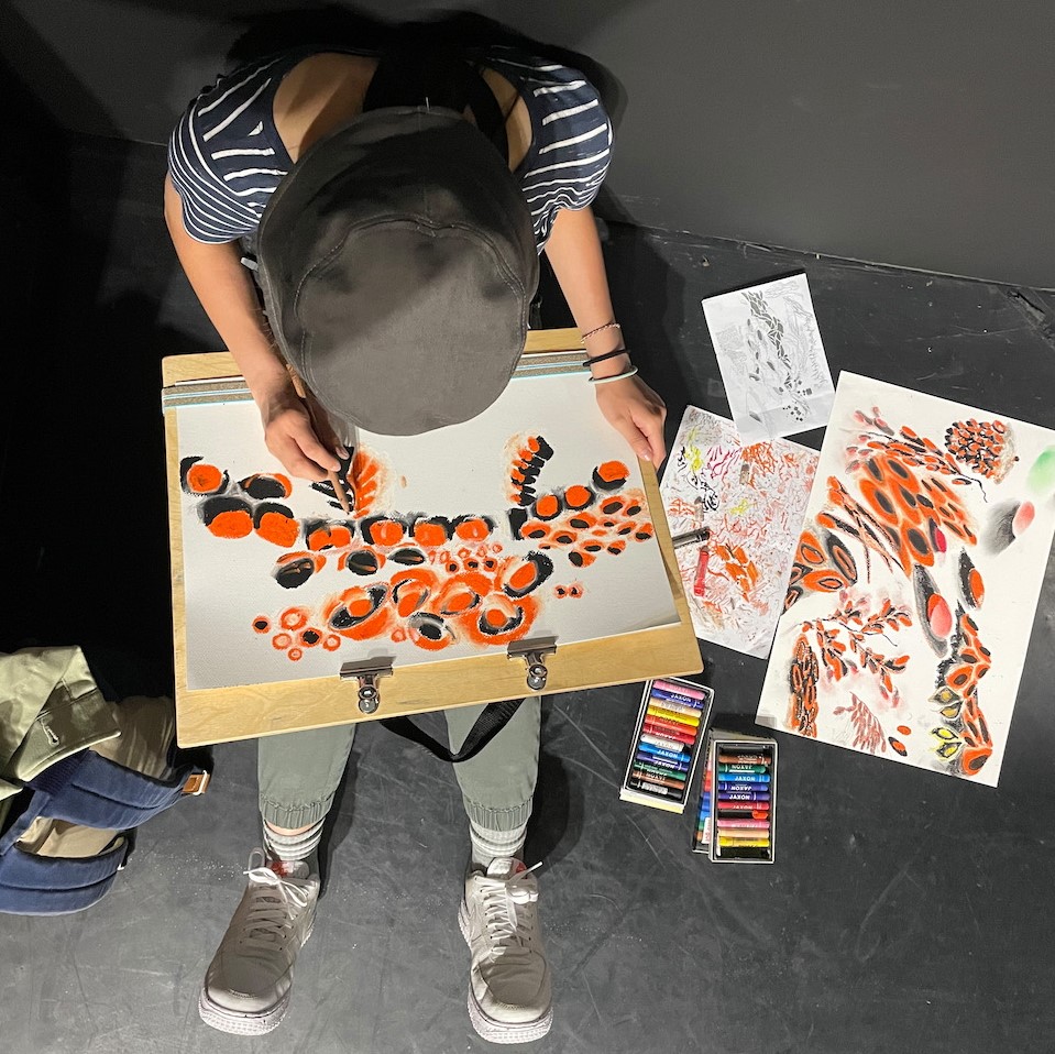 Romelle faszinierte besonders, neue Techniken auszuprobieren. Das erste Mal in ihrem Leben konnte sie mit Pastellkreiden arbeiten. An ihrer Universität, an der sie Fine Arts studiert, arbeitet man sonst eher mit Acryl- und Ölfarben, erzählt sie mir. Für die Zukunft plant sie auch Installationen und Skulpturen zu erschaffen und ihre Erfahrungen des Workshops werden sie vielleicht an der ein oder anderen Stelle inspirieren, auf jeden Fall aber im Gedächtnis bleiben.