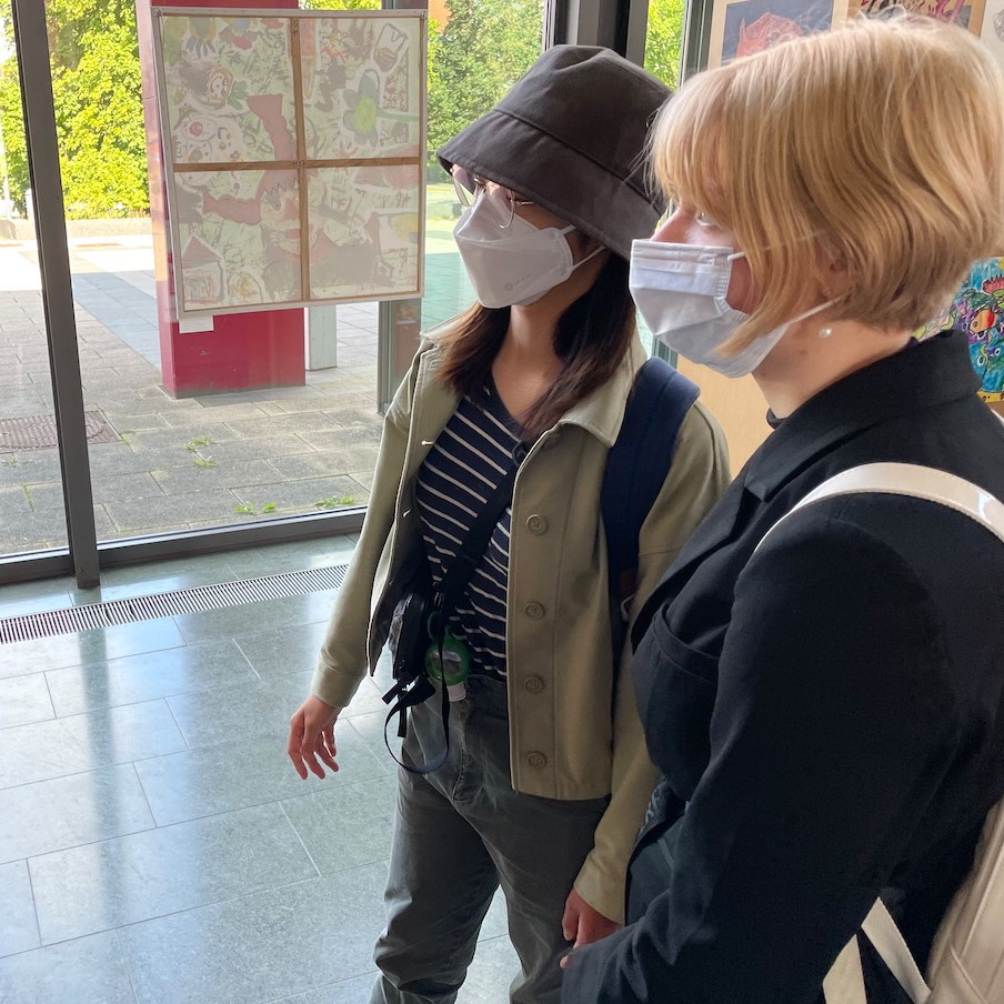 Romelle, welche in Hong Kong lebt, hat über 14 Stunden im Flieger gesessen und die lange Anreise allein auf sich genommen, um am Preisträgertreffen des Wettbewerbs und an der Eröffnung der Ausstellung teilnehmen zu können. Ich frage sie, warum ihre Familie sie nicht begleiten konnte. Offenbar muss Romelle, wenn sie nach Hong Kong zurückkehrt, 21 Tage in Quarantäne und dafür sogar in ein Hotel ziehen. Da ihre Eltern beide arbeiten, war eine Begleitung unter solchen Umständen nicht möglich. Ich freue mich natürlich umso mehr, dass sie die Strapazen der Anreise auf sich genommen hat, um am Preisträgertreffen teilzunehmen. Bei diesem traf sie auf einige der anderen Gewinner und Gewinnerinnen, welche ebenso aus verschiedenen Ländern, wie Taiwan und Lettland angereist sind. Am Abend der Ankunft waren alle aufgeregt, die anderen kennenzulernen. Es wurde sich viel über das Leben und die verschiedenen Kulturen ausgetauscht und schnell Freundschaften geschlossen.