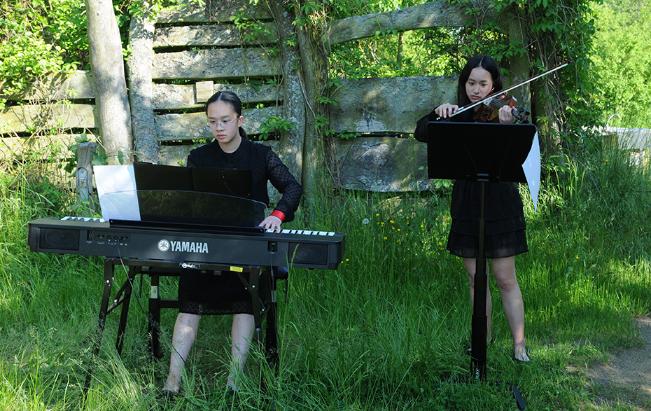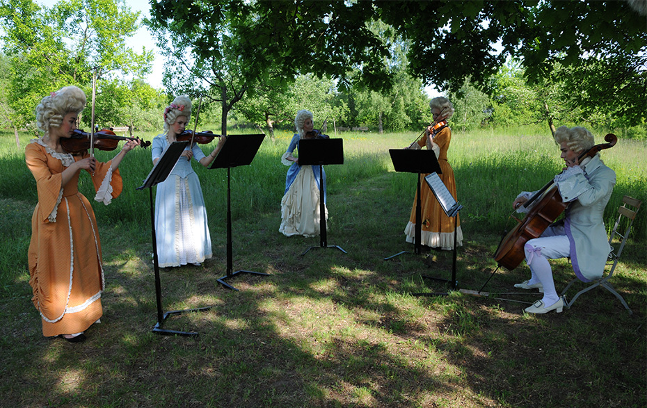 In Vorbereitung auf das Projekt „Naturkonzerthalle“ auf dem Gelände der Blumberger Mühle gab es bereits einen musikalischen Vorgeschmack. Zwei Ensembles der Musik- und Kunstschule Schwedt/Oder hatten sich Anfang Juni zu Filmaufnahmen eingefunden. Bei der Kammermusikgruppe „Vivaldi“ stand, wie sollte es auch anders sein, Vivaldi auf dem Programm und beim Duo Klavier und Violine mit Vi Ngo Dang Phuong (Violine) und Thaovi Seidel (Klavier) lag der Schwerpunkt eher beim Sound der 30er- und 40er-Jahre. Das Streichquintett mit Vi Ngo Phuong (1. Geige), Anna Saritas (2. Geige), Nancy Langer (3. Geige), Ewelina Haftkowska (hatte aus Krankheitsgründen die 4. Geige übernommen) und dem Cellisten Frodo Lück entstand an der Musikschule Schwedt im Oktober 2020 unter der Leitung der Geigenlehrerin Frau Haftkowska. Das Konzert für vier Violinen und Orchester Nr. 10 aus dem Opus 3 „Léstro armonico“ (auf deutsch „Die harmonische Eingebung) von Antonio Vivaldi (1678–1741) ist ein einzigartiges Musikstück der Barockzeit. Vier gleichwertige Geigenstimmen – Geigenkonzerte, die aber gemeinsam spielen, schaffen eine besondere Verbindung zwischen Solo Spiel und Kammermusik. Für dieses Projekt wurde aus der Orchester Partitur die Cello Stimme ausgezogen und leicht modifiziert, sodass daraus ein Konzert für vier Violinen und Violoncello wurde. Das Stück wurde im Jahr 1711 geschrieben und so entstand auch die Idee in der Gruppe, das Werk in „Original-Kostümen“ aus dieser Zeit zu spielen. Dank der freundlichen Unterstützung der Uckermärkischen Bühnen, in Persona des Gewandmeisters A. Westkämper und der Chefmaskenbildnerin Ch. Opitz konnte die Idee professionell (Kostüme, Maske) umgesetzt werden. Für die jungen Musiker ein völlig neue Erfahrung in so engen Kostümen zu musizieren und den Sonnenstrahlen mit Perücke über eine längere Zeit stand zu halten. Die Musikbeiträge können Sie unter diesem Beitrag sehen und hören.