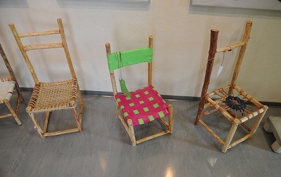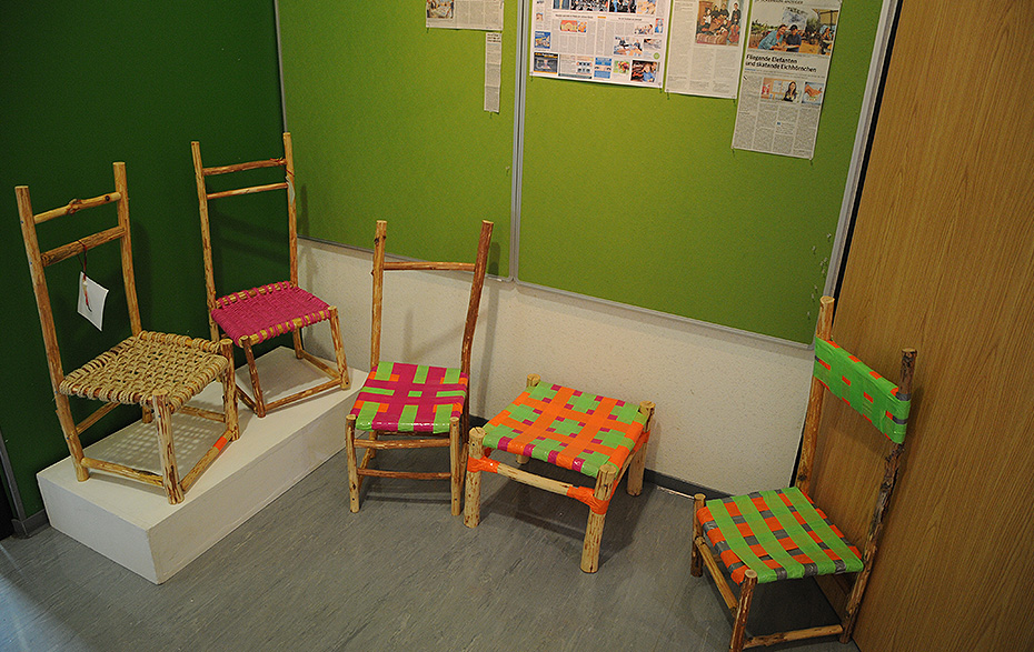 Unter Anleitung von Wenke Paul und Isabella Pikula entstanden die Kunstwerke im Rahmen des Programms „Kultur macht stark. Bündnisse für Bildung“ unter dem Titel „Platz da! Hier bin ich!“ bzw. im Rahmen des Programms „Musische Bildung für alle – Klasse! Kunst im Land Brandenburg“. Sitzen, Stehen, Laufen und Liegen sind mögliche Positionen des Menschen und spiegeln, ikonographisch gesehen, sein Verhältnis zu seiner Umgebung wider. Das Sitzen auf Stühlen ist eine in zivilen Kulturen verbreitete Form des Sitzens. Der Stuhl hat in der Kultur- und Designgeschichte eine interessante Entwicklung vollzogen und man meint,so einen einfachen Gegenstand, wie den Stuhl, nicht neu erfinden zu können. Und genau dies wollten aber die beiden Pädagogen in dem Projekt mit den Kindern versuchen.„Wir wollten einen Stuhl für eine bestimmte Person erschaffen, der nur zu diesem Menschen passt. Durch die Fragestellung, „Welcher Stuhl passt zu mir?“ Es geht in dem Projekt nicht nur darum, eine Sitzgelegenheit zu bauen, sondern die Schüler werden dazu angeregt, über sich selbst, ihre Bedürfnisse und ihr Umfeld zu reflektieren. Vom Modell bis hin zum fertigen Sitzmöbel haben sie alles selbst mit ihren eigenen Händen gebaut.“, so berichtet die Pädagogin Wenke Paul. Als Flechtgestalterin beeindruckt sie die Natur immer wieder aufs Neue und diese Begeisterunghat sie offensichtlich auch auf die Kinder übertragen. Zumindest lassen dietollen Ergebnisse der Kinder diese Interpretation zu.