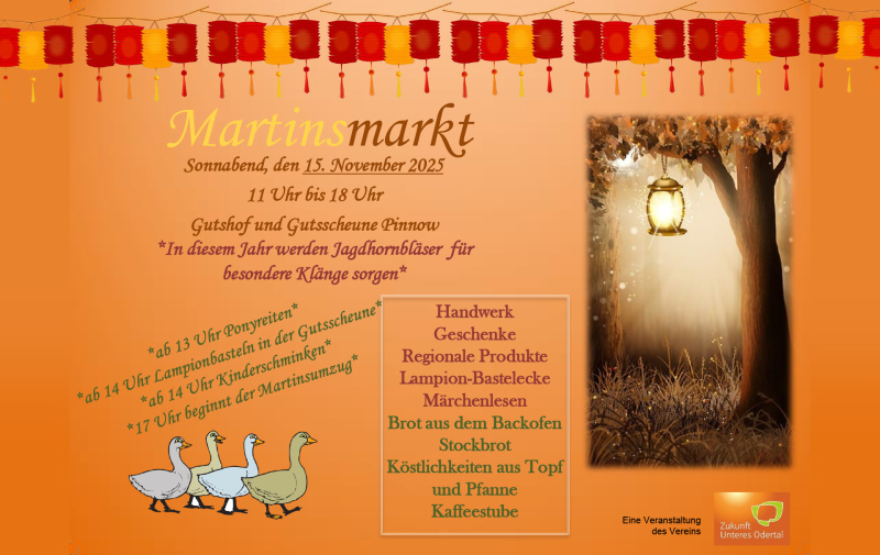 Auf dem Gutshof und in der Gutsscheune Pinnow veranstaltet der Verein Zukunft Unteres Odertal e. V. am 15. November 2025 von 11 bis 18 Uhr den Martinsmarkt statt.