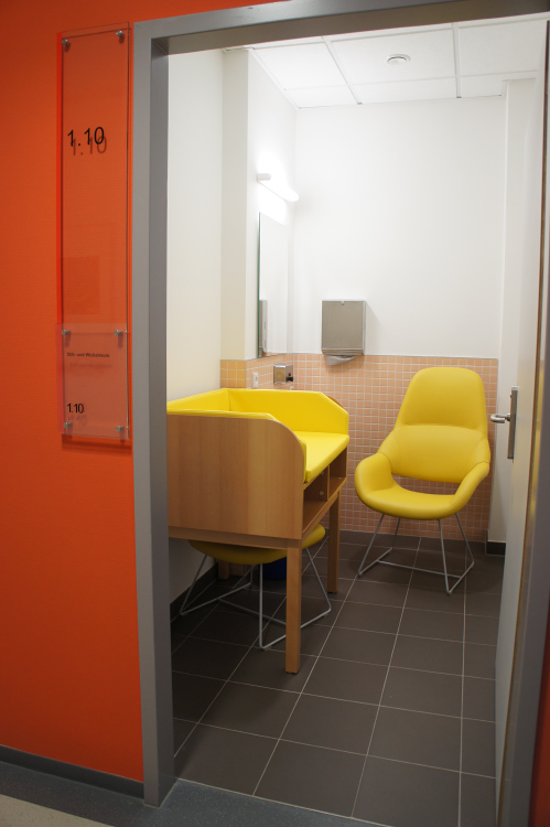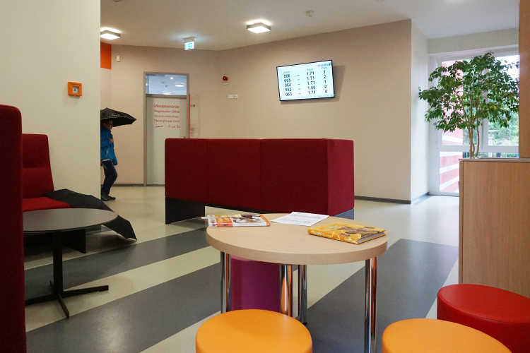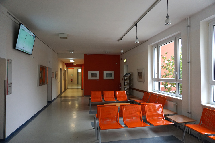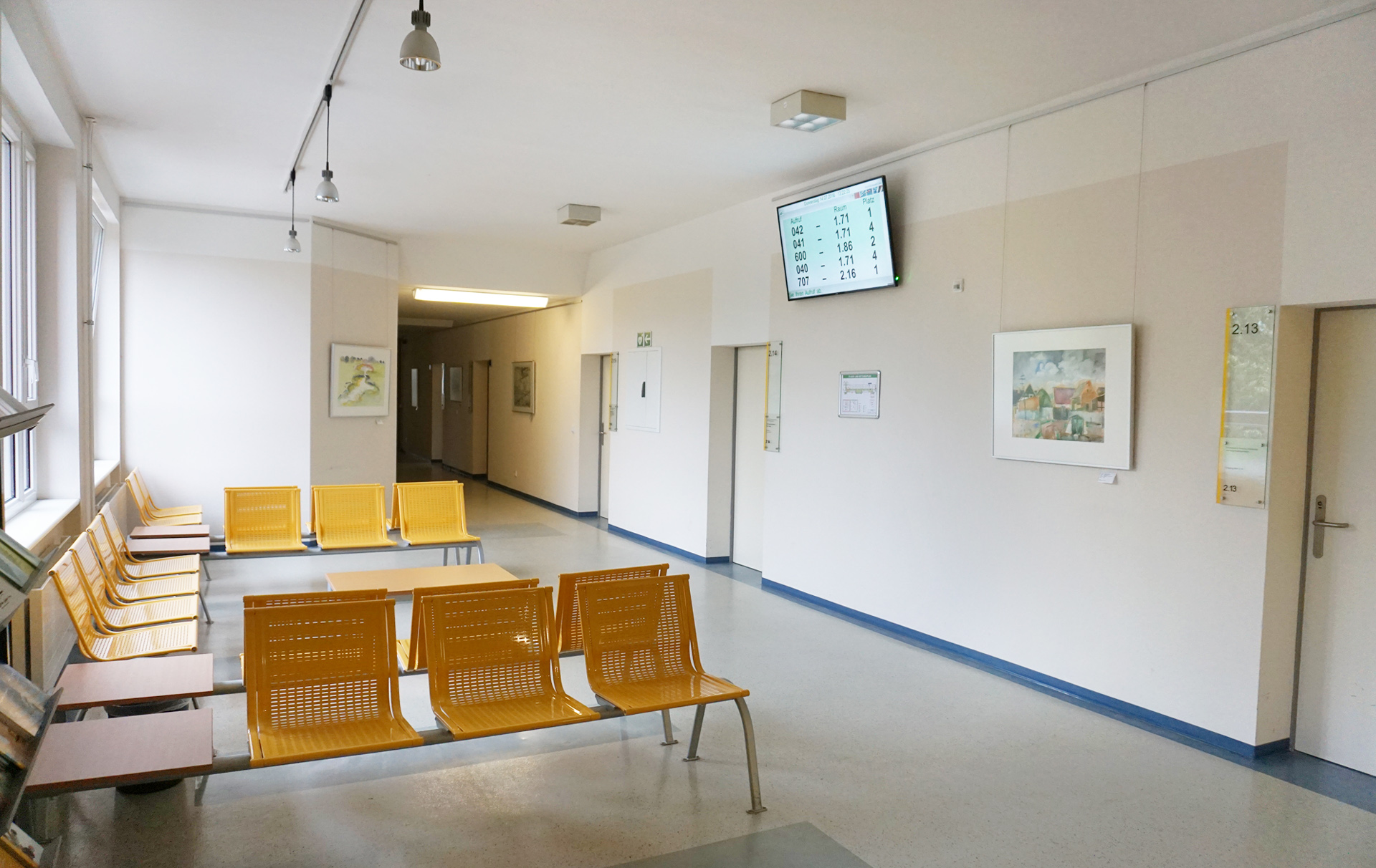 Die Wartebereiche befinden sich in der 1. (roten) Ebene und in der 2. (gelben) Ebene. Auf den dortigen Bildschirmen wird neben der Aufruf-Nummer der Raum angezeigt, der aufzusuchen ist.