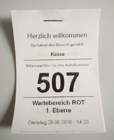 Die Marke nennt neben der Nummer den gewählten Bereich und in welcher Ebene der Wartebereich aufzusuchen ist.