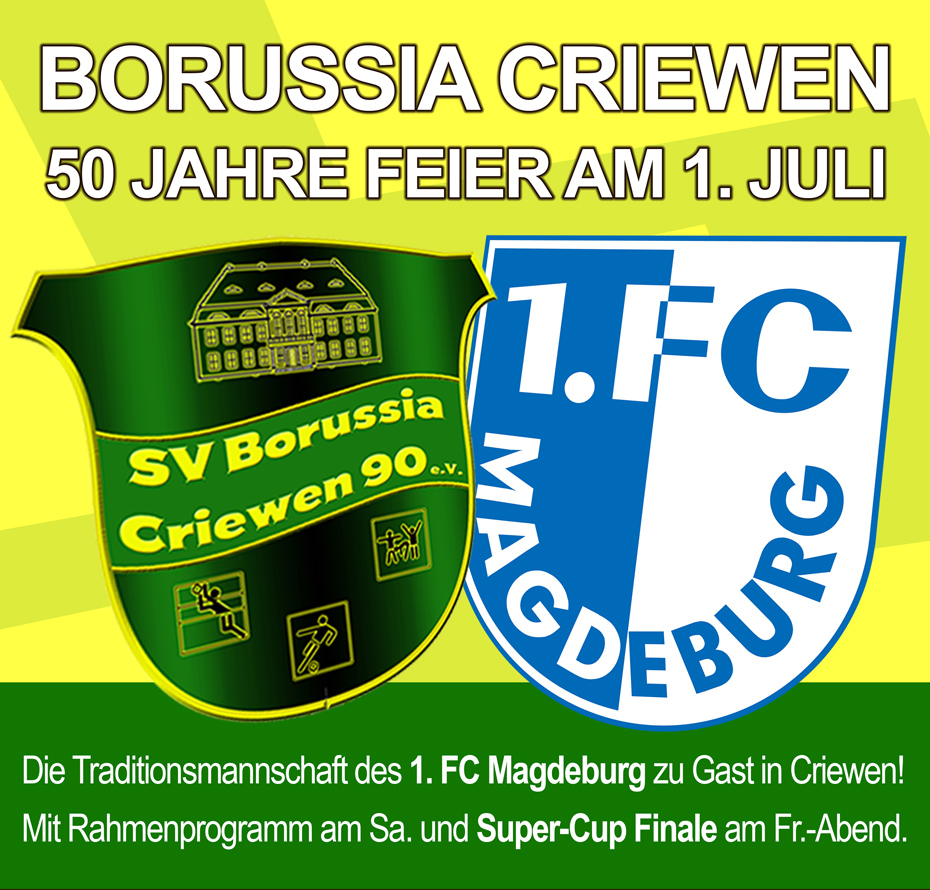 Aus diesem Anlass wird ein Spiel- und Sportfest ab 10 Uhr auf dem Criewener Sportplatz stattfinden. Neben den sportlichen Aktivitäten beim Fußball und Volleyball sollen sich auch die Besucher sportlich betätigen können. Höhepunkt des Tages wird ab 14 Uhr das Freundschaftsspiel gegen die Traditionsmannschaft des 1. FC Magdeburg sein. Für das leibliche Wohl ist natürlich auch gesorgt.