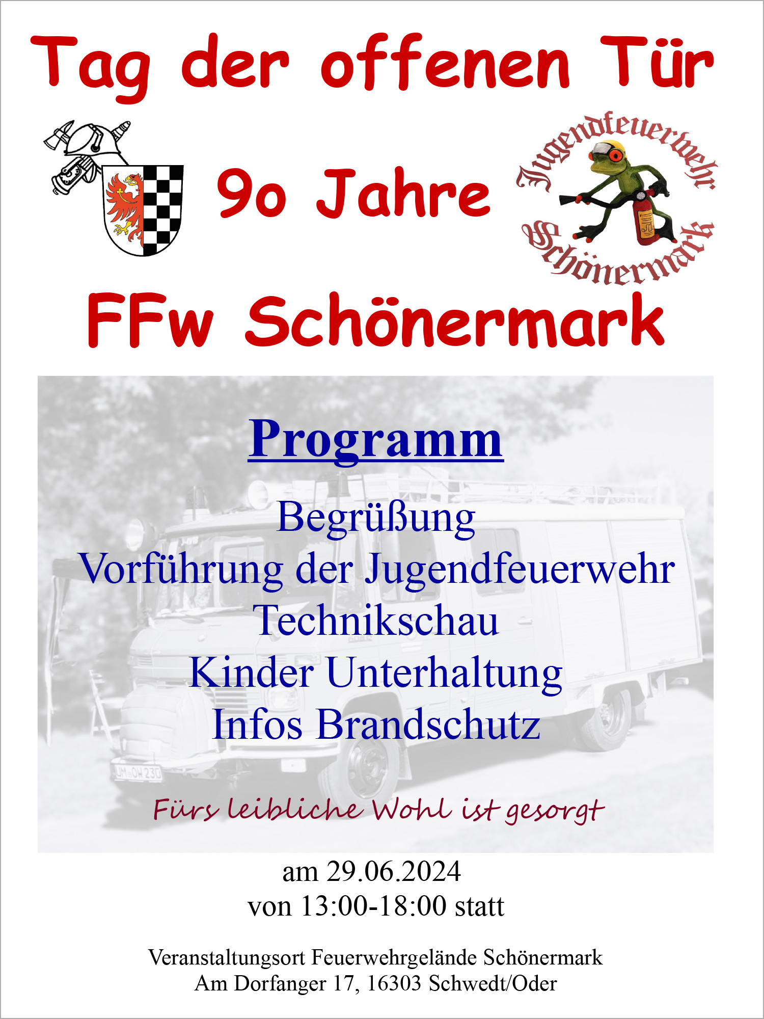 Auf dem Feuerwehrgelände Schönermark, Am Dorfanger 17, wird am 29. Juni 2024, von 13 bis 18 Uhr gefeiert.