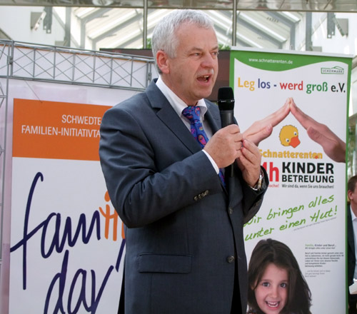 Der traditionelle Family Day fand dieses Jahr am Freitag, dem 26. April 2013, im Oder-Center statt. Die Veranstaltung ist der jährliche Höhepunkt in der Arbeit des Lokalen Bündnisses „Familienfreundliches Schwedt“. Bürgermeister Jürgen Polzehl eröffnete den 8. „Family Day“ und übernahm zur Eröffnung der Festveranstaltung die Schirmherrschaft für das „Sternstundenprojekt“ des Vereins „Leg los, werd groß“.