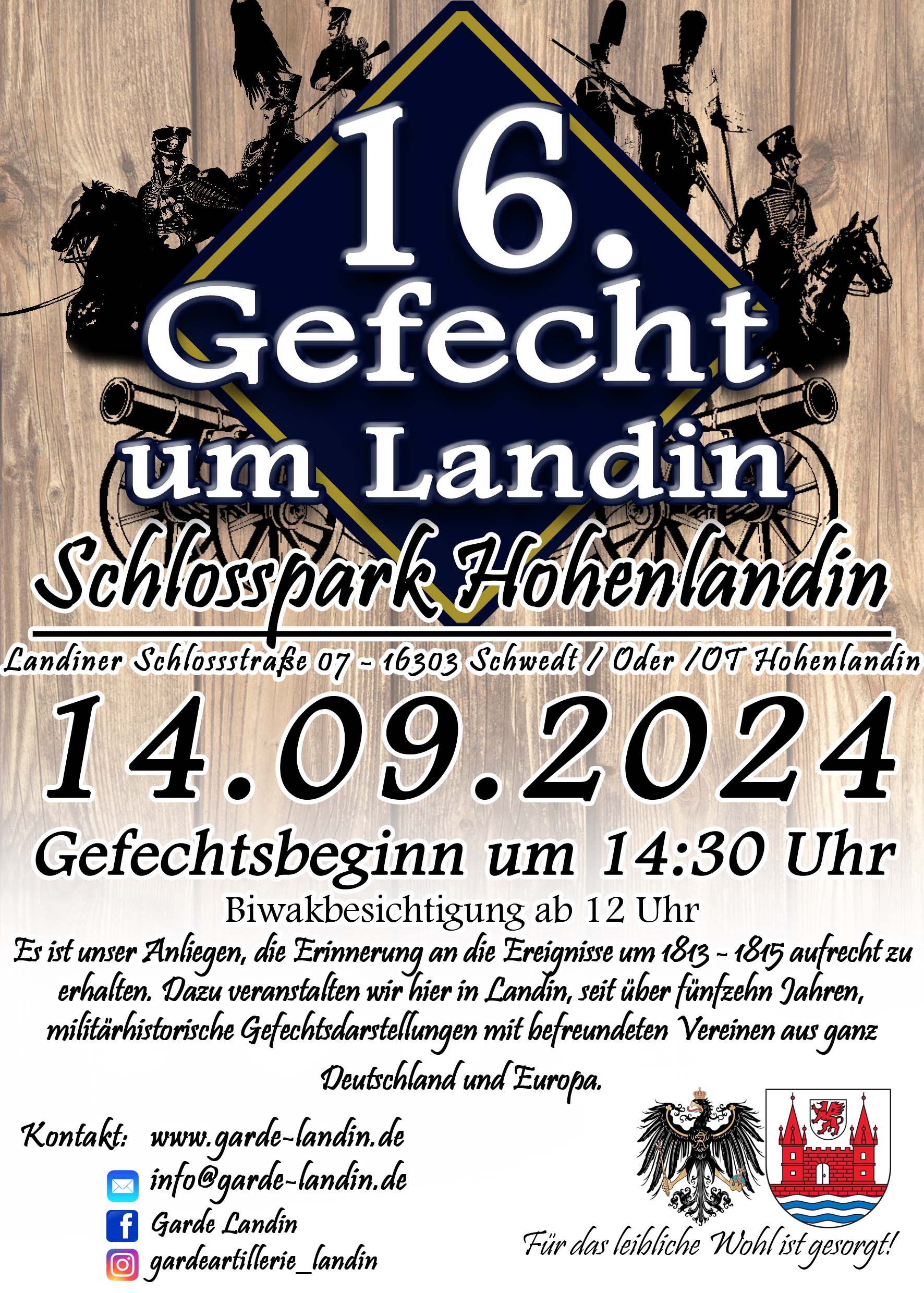 Die Garde aus Landin beim Festumzug. (Foto: Giesa, 2005)Das Gardeartillerieregiment Landin veranstaltet am 13. und 14. September 2024 ein Biwak aus den Zeiten der Napoleonischen Befreiungskriege zwischen 1813 und 1815. Die Gefechtsvorführung wird am 14. September, ab 14:30 Uhr am Schlosspark in Hohenlandin stattfinden. Das Biwak kann am 14. September. ab 12:00 Uhr besichtigt werden. Die Soldaten geben gern Auskunft über ihr dargestelltes Regiment bzw. ihre Einheit. Es kann Kavallerie, Infanterie und Artillerie vor Ort hautnah besichtigt werden. Dargestellt wird, wie man sich vor über 200 Jahren versorgte, kleidete und in den Kampf gezogen ist.