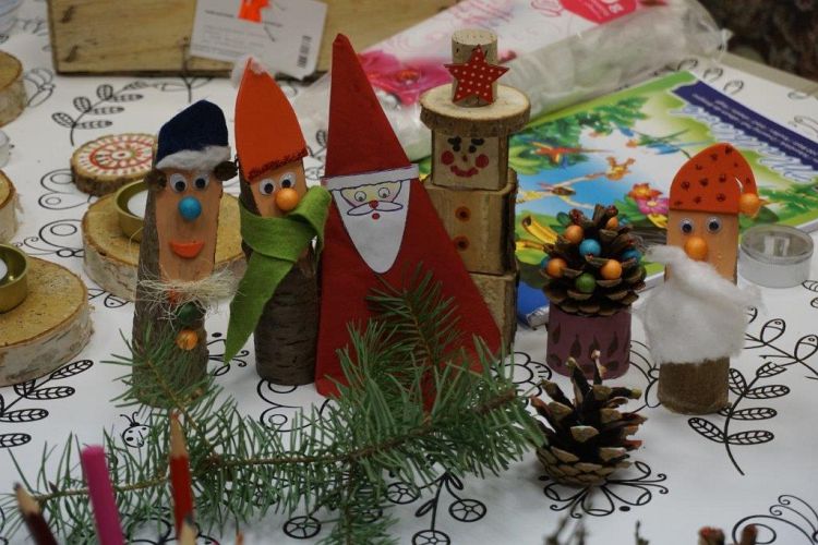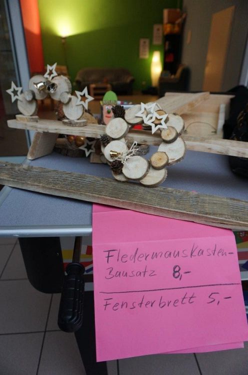 Der Stand des Biologischen Schulgartens war mit selbst gefertigten Produkten wie Fensterbänken für Schwibbögen, Fledermauskästen und weihnachtlichen Holzdekorationen vertreten.
