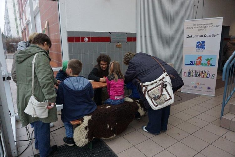 Im Talsand-Center wurde ein Flohmarkt organisiert, der zum Stöbern und Einkaufen einlud. Dabei wurden u. a. selbst entworfene und angefertigte Produkte der BIWAQ-TeilnehmerInnen, wie Mützen, Kinderbekleidung, Kosmetiktaschen u. v. m. angeboten und verkauft. Innerhalb der Verkaufsgespräche entwickelten sich weitere kreative Produktideen sowie Umsetzungsstrategien.