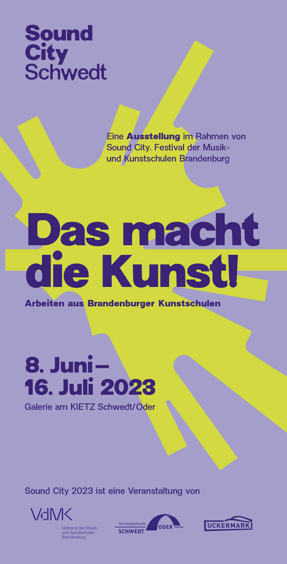 Im Rahmen von Sound City, dem Festival der Musik- und Kunstschulen Brandenburg, zeigt die Ausstellung eindrucksvoll, was die Kunst an Brandenburger Kunstschulen macht. Vom künstlerischen Nachwuchs zwischen 6 und 25 Jahren sind Fotos, Zeichnungen, Malerei, Collagen, Keramiken, Installationen und mehr zu entdecken.