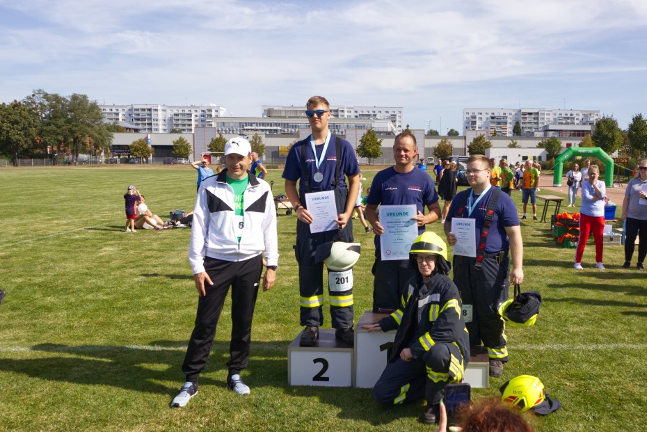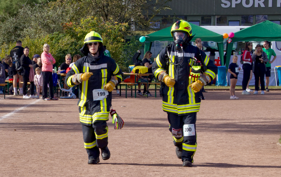 Eine besonders herausragende Leistung zeigten die Kameraden der freiwilligen Feuerwehr der Ortsgruppe Berkholz-Meyenburg. Sie traten in kompletter Ausrüstung und mit Atemschutz an und absolvierten die 2-km-Strecke.