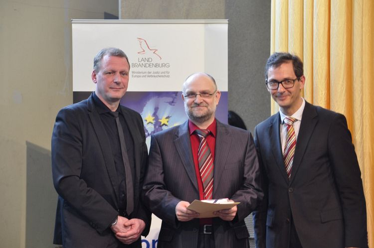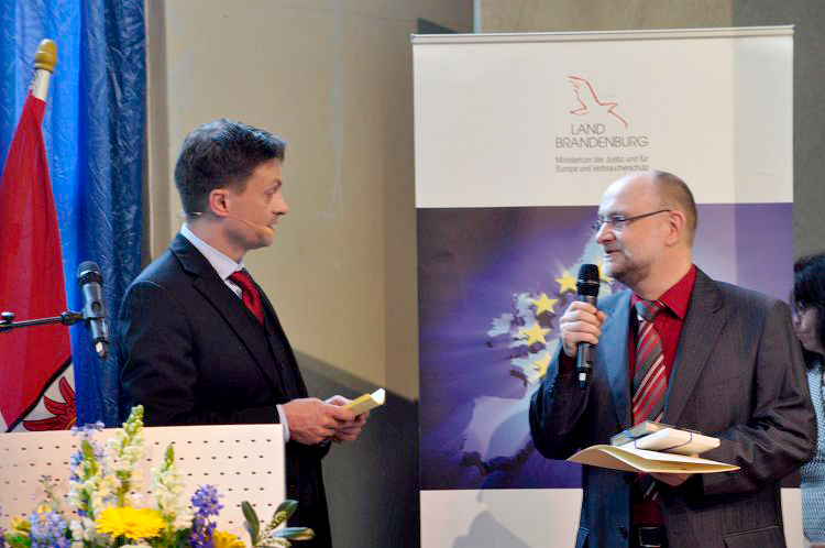 „Mit der Verleihung der Urkunde zeichnen wir Frauen und Männer aus, die sich im Land Brandenburg und über dessen Grenzen hinaus, durch ihr Handeln und ihre kreativen Ideen hervorgetan haben,“ so Dr. Pienkny. „Sie haben ihre Ideen und Projekte ehrenamtlich entwickelt und sich für ein vereintes Europa eingesetzt. Dafür gebührt Ihnen unser und mein ganz persönlicher Dank.“ In seiner Rede wies er auf die großen Aufgaben und Herausforderungen hin, vor denen die Europäische Union steht. Er ermutigte alle, „die sich für die europäische Idee begeistern, sich auch für Europa zu engagieren.“