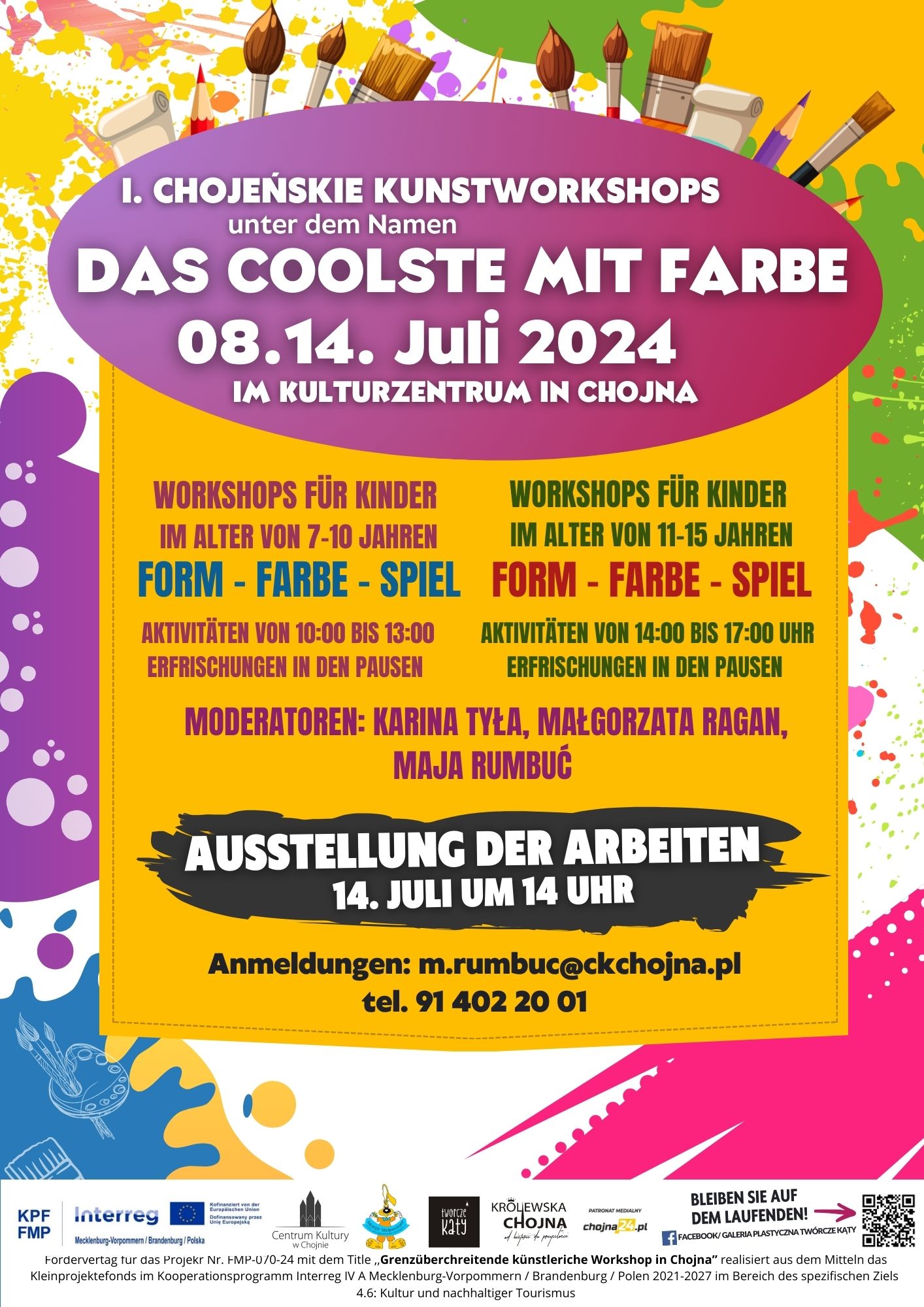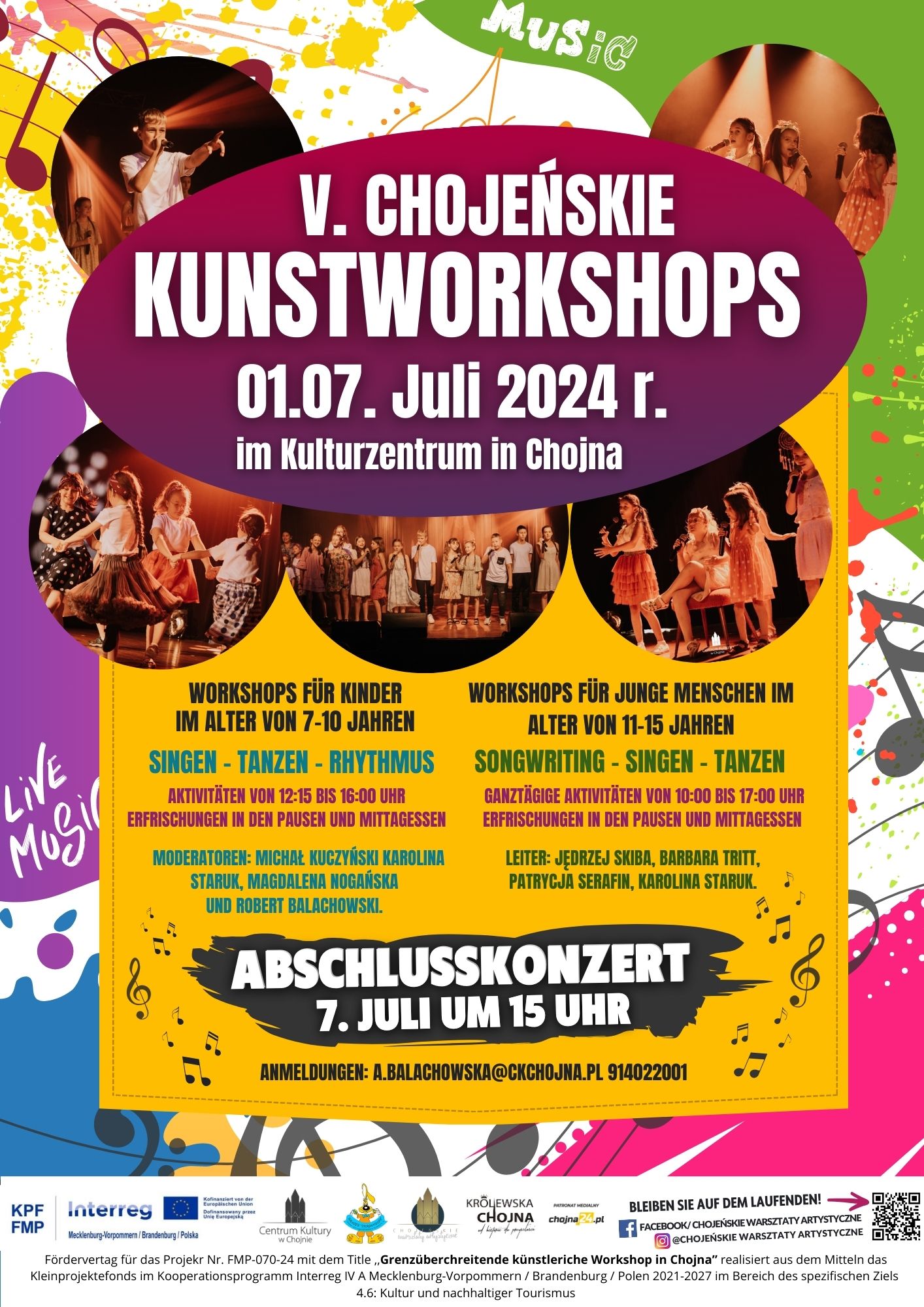 Die Veranstalter laden am 7. Juli 2024, um 15 Uhr zum Abschlusskonzert des Musikworkshops (Gesang, Tanz, Komposition) und am 14. Juli 2024, 14 Uhr zur Vernissage des künstlerischen Workshops ins Kulturzentrum Chojna, Plac Konstytucji 3 Maja, PL-74500 Chojna herzlich ein.