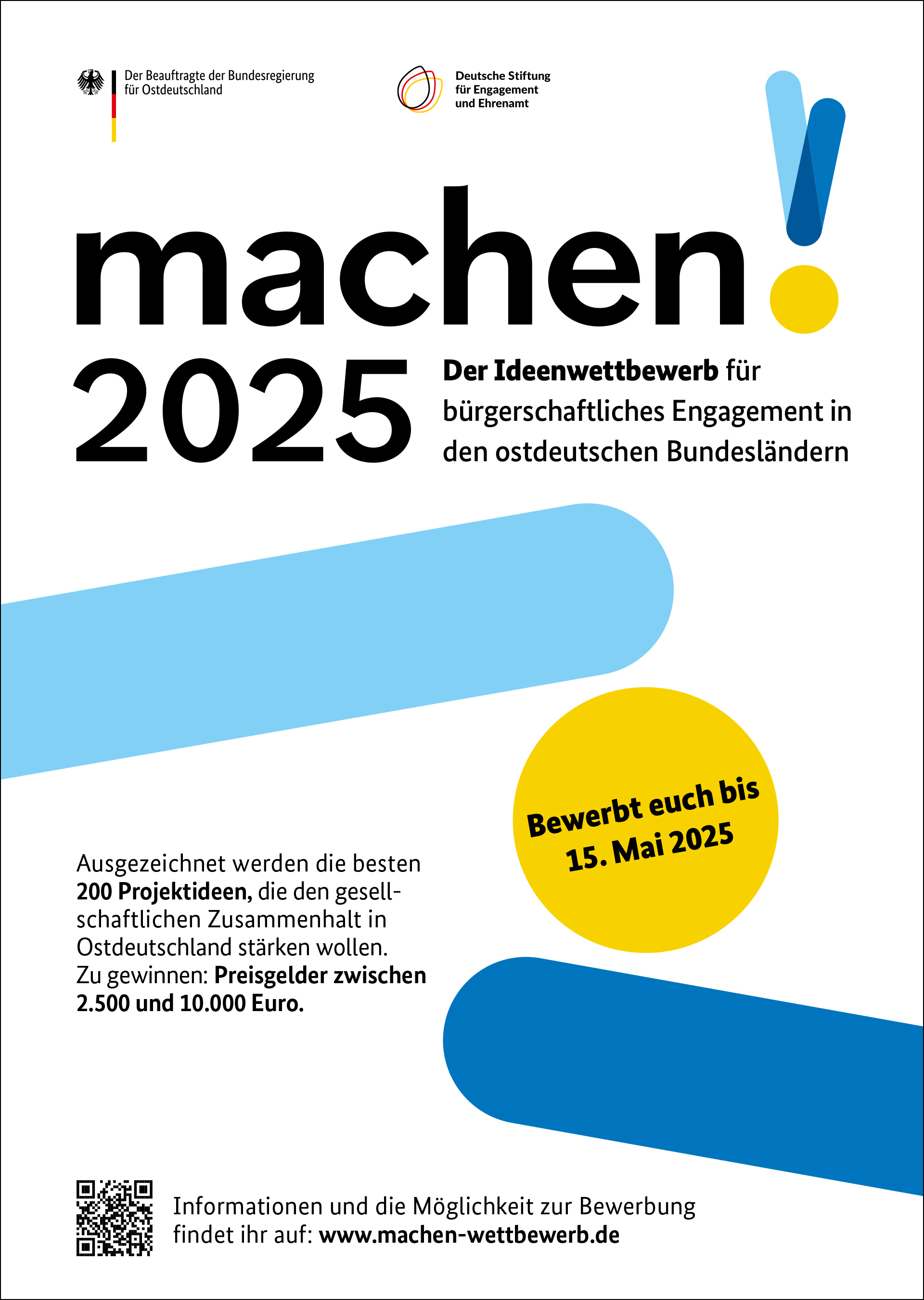 Bis zum 15. Mai 2025 können Engagierte und Ehrenamtliche aus den ostdeutschen Bundesländern ihre Ideen für ein gutes Miteinander beim Wettbewerb „machen!2025“ einreichen. Der Wettbewerb wird gemeinsam vom Ostbeauftragten der Bundesregierung und der Deutschen Stiftung für Engagement und Ehrenamt ausgerichtet. Insgesamt werden 200 Projektideen mit Preisgeldern zwischen 2.500 und 10.000 Euro ausgezeichnet.