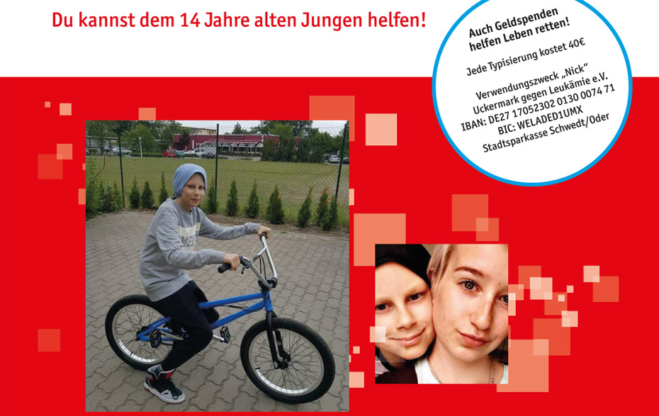 Nick kommt aus Schwedt und leidet bereits zum zweiten Mal unter Krebs. Die Diagnose lautet Neuroblastom im Rezidiv. Er ist dringend auf eine Stammzellspende angewiesen, um zu überleben. Du bist gesund und zwischen 17 und 55 Jahre alt? Dann nutze die Gelegenheit und werde in 2 Minuten schmerz- und kostenfrei zum potenziellen Lebensretter.