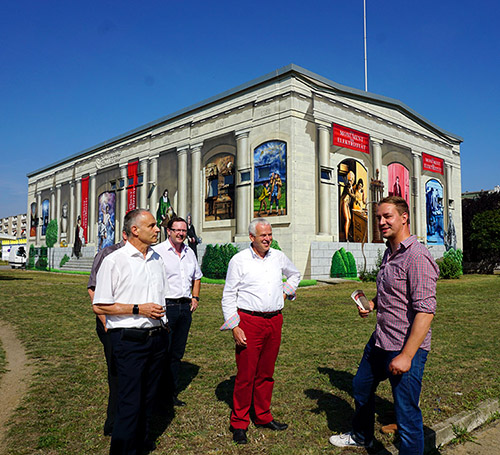 „Wir haben mit der Fassadenkunst in und an unseren Gebäuden bereits im Jahr 2007 begonnen, aber mit 1.130 Quadratmetern ist dieses Bauwerk das größte Objekt“, so Helmut Preuße, Geschäftsführer der Stadtwerke Schwedt. „Heute übergeben wir dieses Schmuckstück als Geschenk zum Stadtjubiläum an den Bürgermeister, Herrn Polzehl“, ergänzt er.