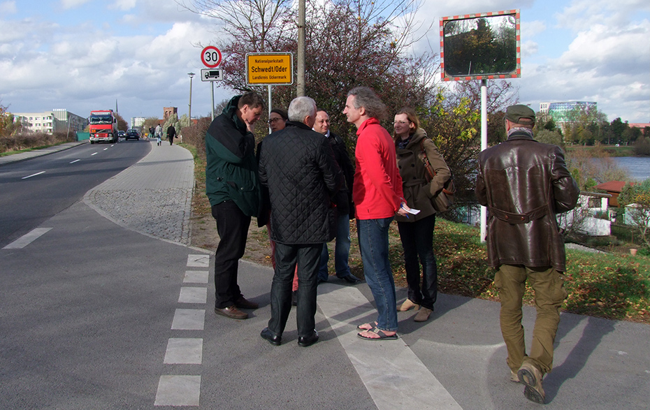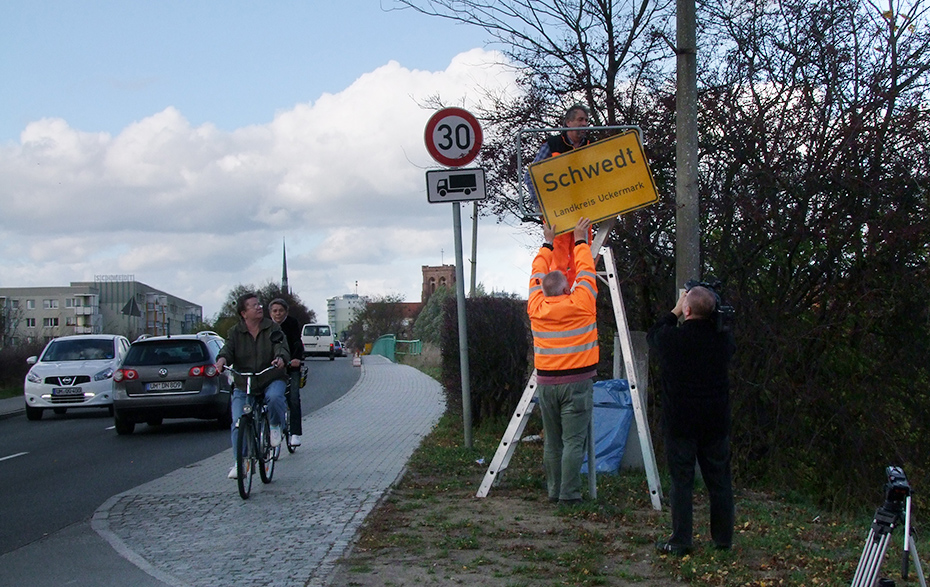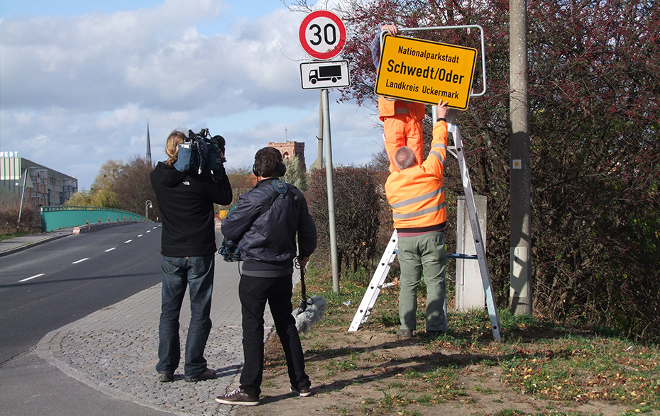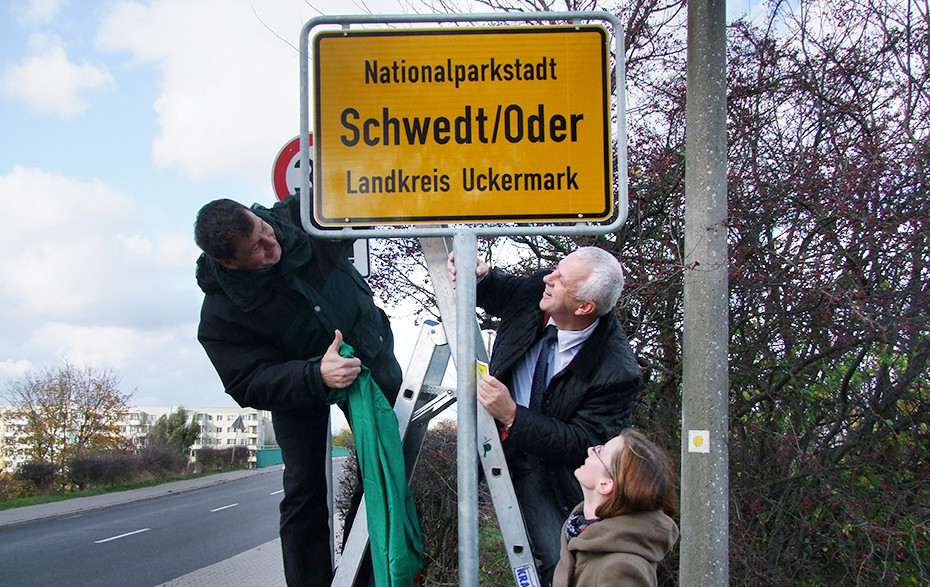 Am Dienstag, dem 29. Oktober 2013, enthüllten Bürgermeister Jürgen Polzehl, Nationalparkleiter Dirk Treichel und Geschäftsführerin des Tourismusvereins Nationalpark Unteres Odertal e. V. Susanne Pätzold das erste der neuen Ortseingangsschilder der Nationalparkstadt Schwedt/Oder.