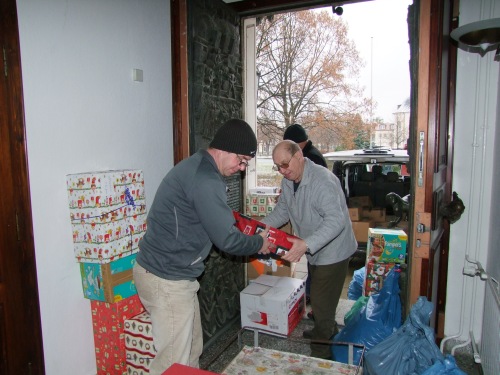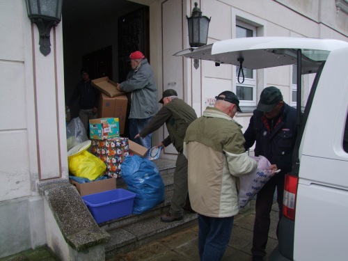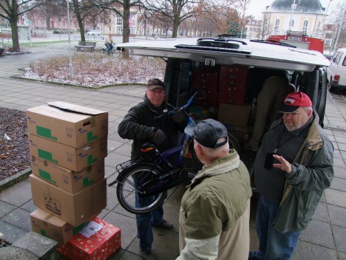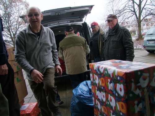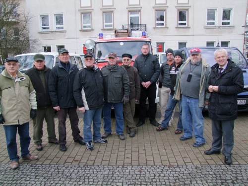 Die Fahrer vom Freundeskreis Kinderheim Ocland (Okland) verabschiedeten sich am 5. Dezember 2012 vor dem Schwedter Rathaus offiziell von Bürgermeister Jürgen Polzehl. Am frühen Donnerstagmorgen starteten sie in Richtung Rumänien.