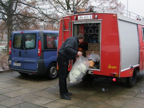 Der Konvoi, bestehend aus vier Transportern des EJF, des DRK, der Wohnbauten GmbH und der Stadtverwaltung Schwedt/Oder, wird von einem Feuerwehrfahrzeug älteren Baujahrs begleitet. Das Feuerwehrfahrzeug konnte mit Hilfe der PCK-Werksfeuerwehr eine neue Ausrüstung erhalten und befindet sich jetzt in einem technisch einwandfreien Zustand. Es wird den Kameraden der Feuerwehr in Ocland künftig gute Dienste leisten.