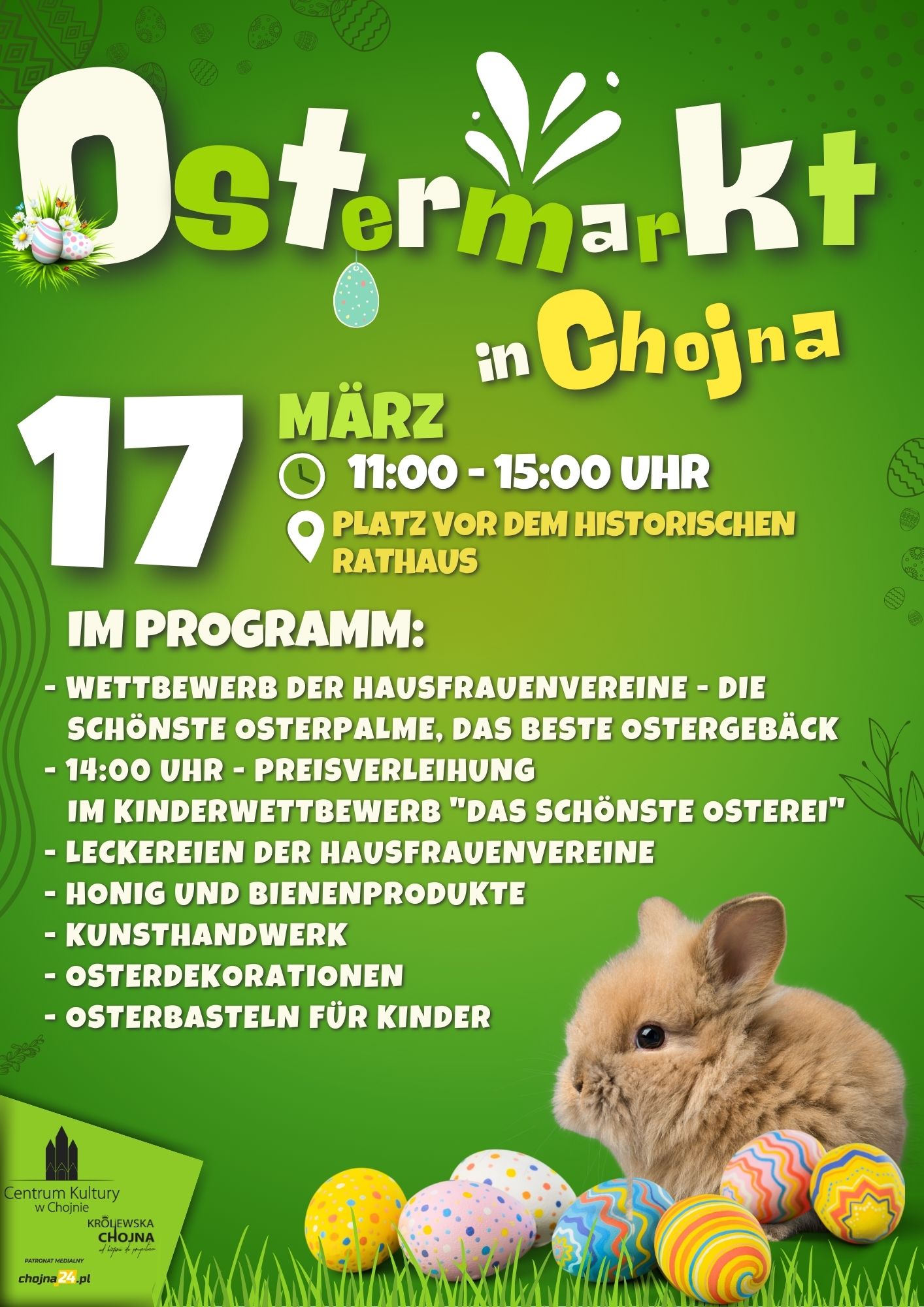 Am 17. März 2024, von 10 bis 15 Uhr, findet auf dem Platz vor dem historischen Rathaus in der Stadt Chojna ein Ostermarkt statt.