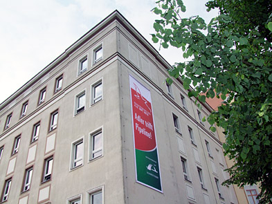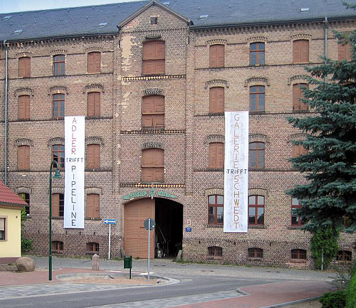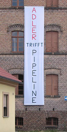 Nach dem Internationalen Landschaftpleinair in der Galerie am Kietz im Juli schmücken zwei Fahnen den ehemaligen Tabakspeicher am Kietz. Mit „ADLER TRIFTT PIPELINE“ und „GALERIE TRIFFT SCHWEDT“ lädt die Galerie zum Besuch der aktuellen Kunstausstellung ein. Mehr