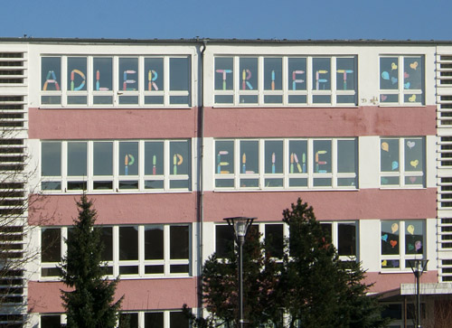 Die Schule „Am Schloßpark“ in der Berliner Straße 50, zwischen Uckermärkischen Bühnen und Kosmonaut, wirbt mit bunten Buchstaben an ihrer Fensterfront für den BRANDENBURG-TAG. Lehrer und Schüler luden Bürgermeister Jürgen Polzehl und Beigeordneten Lutz Herrmann am 23. März 2010 ein und präsentierten ihnen diese liebevolle Werbung.