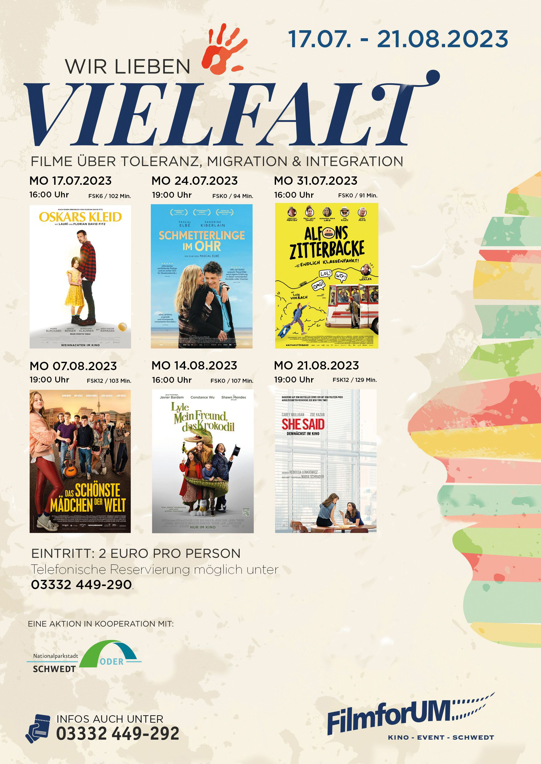 In Kooperation mit der Stadt Schwedt/Oder bietet das FilmforUM Schwedt vom 17. Juli bis 21. August (montags) ein kostengünstiges, zusätzliches Filmangebot für Familien unter dem Motto „Wir lieben Vielfalt“ an. Sechs Filme über Toleranz, Integration, Freundschaft und harmonisches Zusammenleben werden für zwei Euro pro Person geboten. Diese Einladung richtet sich an alle Kino-Begeisterten von Jung bis Alt, mit und ohne Migrationshintergrund.