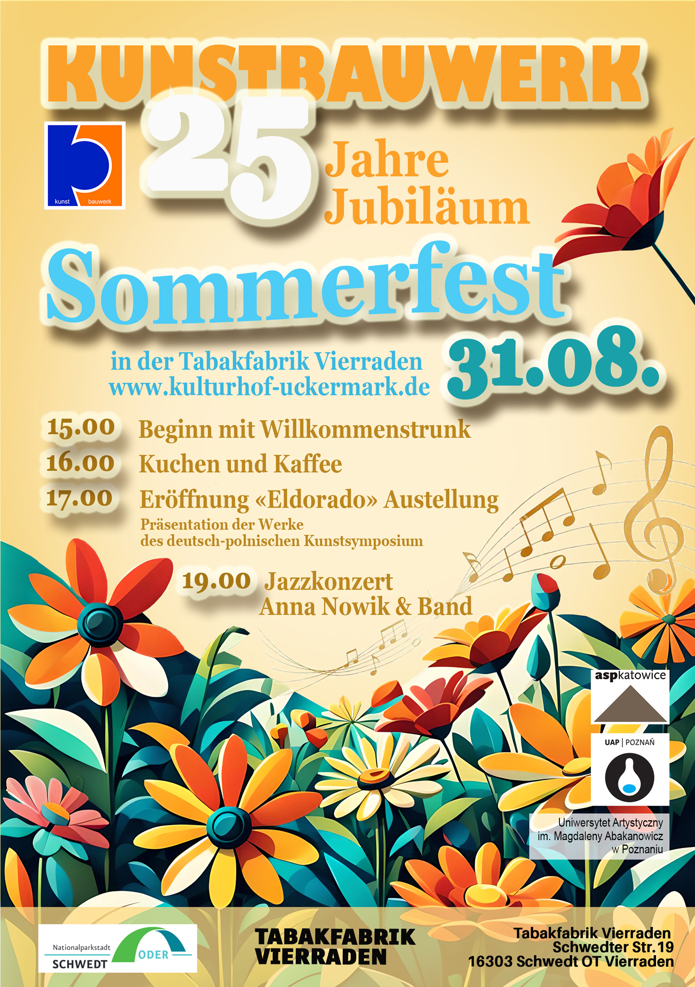 Um 19 Uhr bieten Anna Nowik und Band ein Jazzkonzert. Der einzigartige Stil der Band entstand durch die Inspiration von Dixieland-Musik und traditionellem Jazz. Im umfangreichen Repertoire der Band finden sich nicht nur die Klassiker des Jazz, sondern auch der Unterhaltungs- und klassischen Musik, die von den Zwanzigern bis zu den heutigen Chart-Hits reichen. Anna Nowik (Sängerin, Posaunistin und Trompeterin) leitet die Band seit 2001. Sie ist Preisträgerin renommierter Wettbewerbe für traditionelle und Dixieland-Musik, darunter die Goldene Tarka im Jahr 2023. Sie tritt als Solistin sowie mit ihrer eigenen Band in Polen, Deutschland und Dänemark auf. Mehr unter https://annanowik.com/en/.