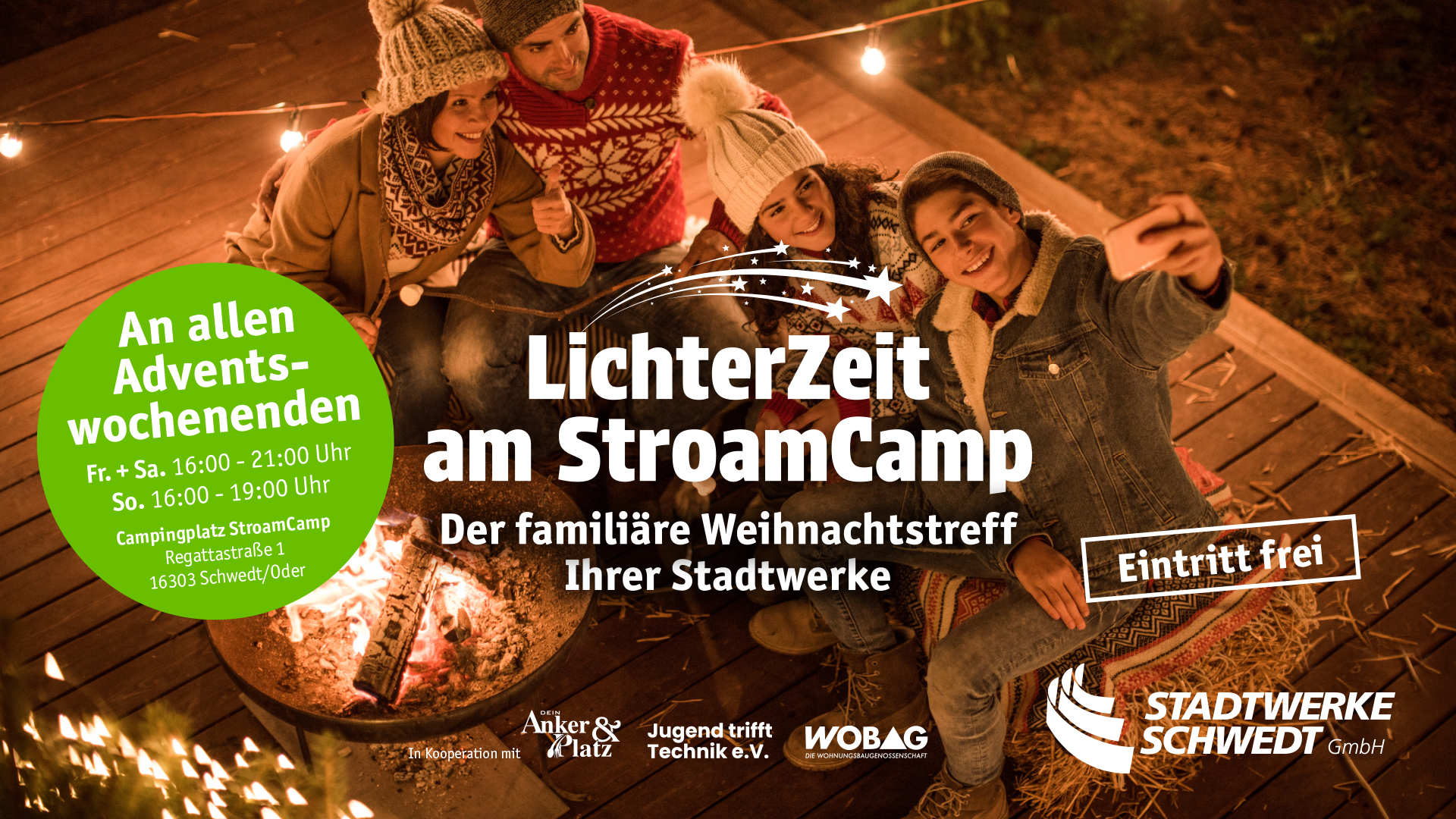 An allen vier Adventswochenenden laden die Stadtwerke Schwedt bei freiem Eintritt jeweils Freitag bis Sonntag zu diesem besonderen Adventserlebnis ein. Jedes Jahr sorgen die Stadtwerke bereits in der Vierradener Straße für eine weihnachtliche Beleuchtung. Dieses Jahr kommt die „LichterZeit“ am Campingplatz in der Regattastraße dazu. Vom 28. November bis 21. Dezember verwandelt sich die Zeltwiese des Campingplatzes StroamCamp in einen Ort voller Licht, Begegnung und adventlicher Stimmung.