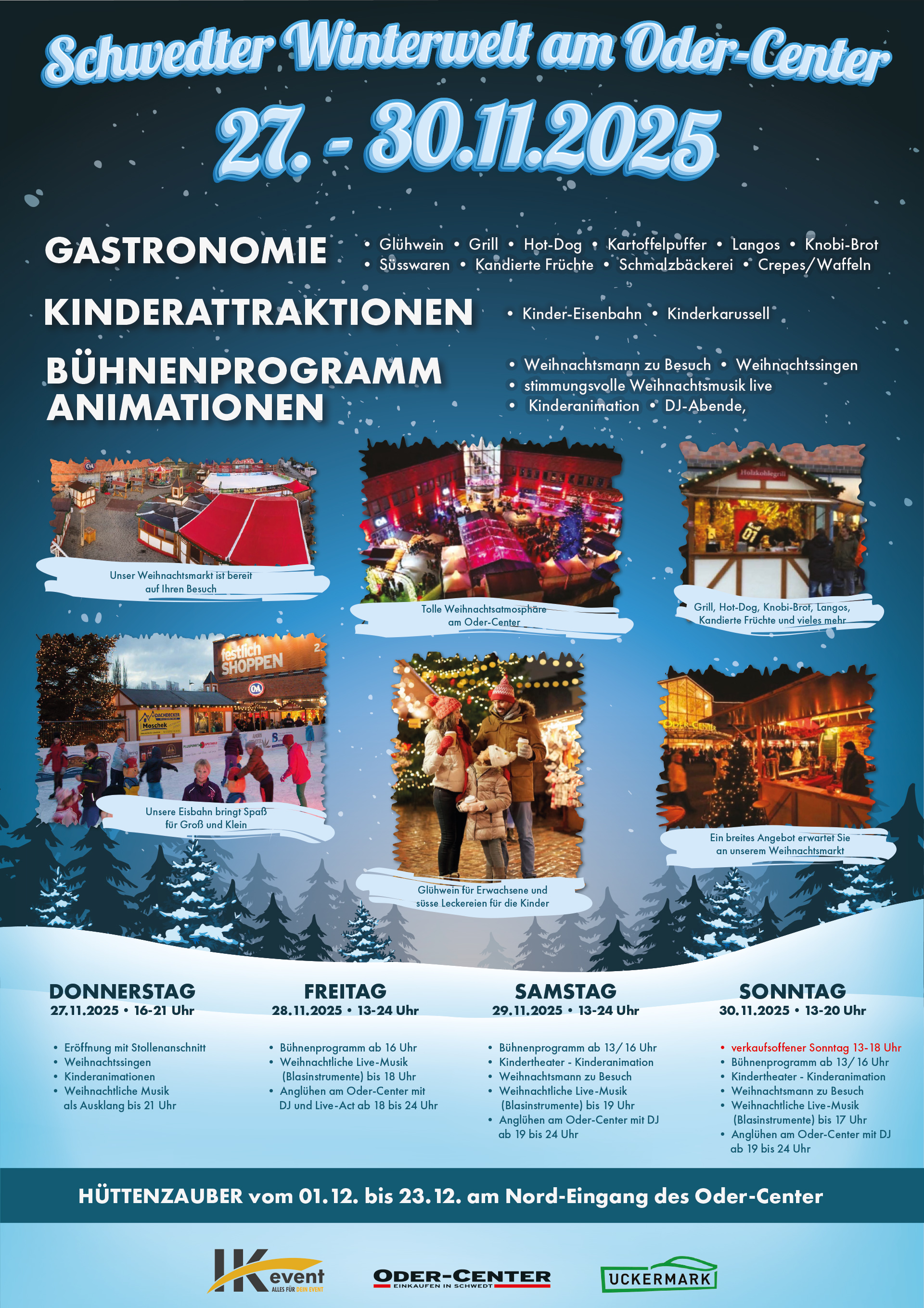 Vom 27. bis 30. November verwandelt sich der Vorplatz des Oder-Centers in die Schwedter Winterwelt – ein offenes Winterareal mit stimmungsvoller Beleuchtung, beheiztem Gastraum, Gastzelten, Feuertischen und Holzmobiliar, dazu Kinderkarussell, Kinder-Eisenbahn sowie eine Eisstockbahn. Die Winterwelt schließt die Lücke des entfallenen Wintermärchenmarkts und knüpft an beliebte Adventsformate der vergangenen Jahre an. Ein Auszug der Highlights: Donnerstag – Eröffnung, Inklusionstag und Feuershow; Freitag – Marcus Christiansen, Theater Stolperdraht, Anglühen mit DJ Hamster; Samstag – Clown Kleks, Live-Musik, Weihnachtsparty mit DJ Alex; Sonntag – Live-Band, Feuershow, Eisprinzessin, Weihnachtssingen mit den Jagdhornbläsern Schwedt. Weitere Programmpunkte: Kinderanimation & Kinderdisco, familienfreundliche Aktionen und Live-Musik über alle Tage.