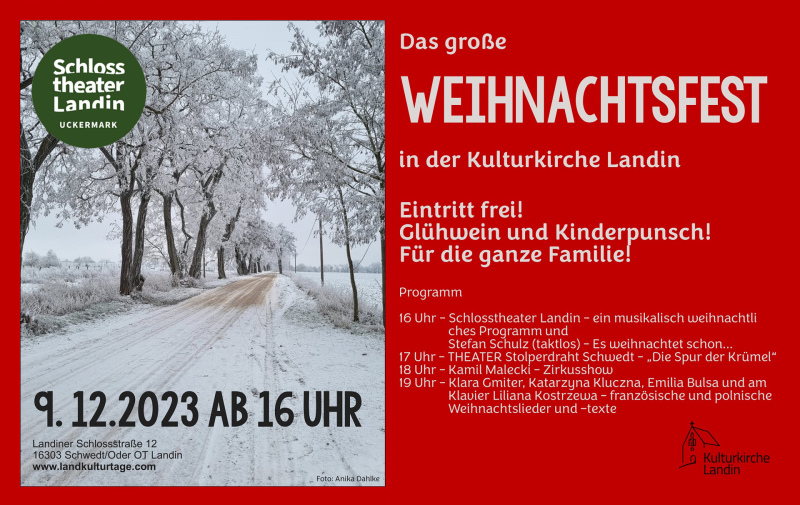 Am Samstag, dem 9. Dezember 2023, lädt das Schlosstheater Landin zum großen Weihnachtsfest in die Kulturkirche Landin ein.