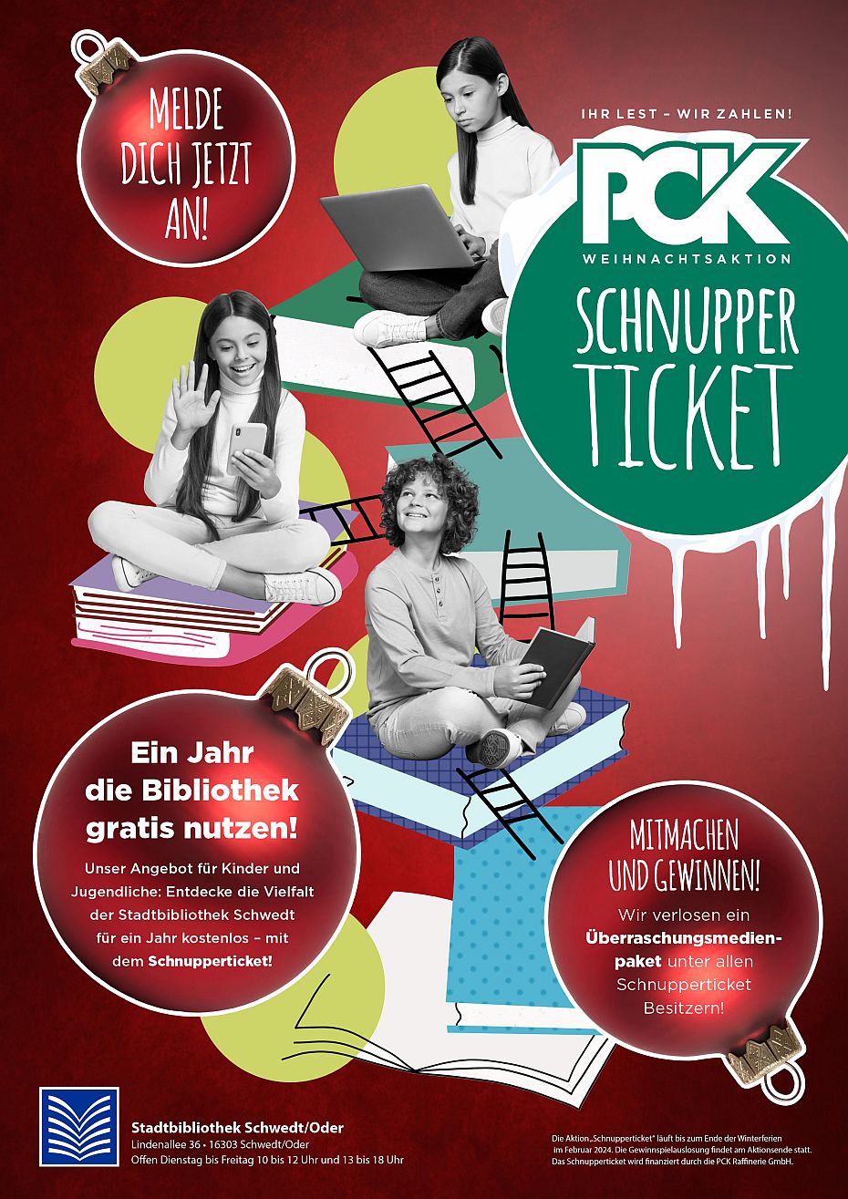 Gemeinsam mit der Stadtbibliothek Schwedt/Oder startet PCK eine Weihnachtsaktion. Unter dem Motto „Ihr lest, wir zahlen!“ lädt die Raffinerie junge Menschen ein, sich in der Bibliothek anzumelden. Die Schnupper-Mitgliedschaft wird ein Jahr von der PCK übernommen und ist somit kostenlos. Gleichzeitig nehmen alle neuen „Schnuppermitglieder“ an einem Gewinnspiel teil. Die Aktion geht bis zum Ende der Winterferien im Februar 2024.