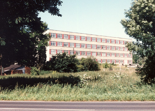 Hinter der Eisenbahnbrücke, am Gelände der PCK Raffinerie entlang setzt sich die Straße fort.